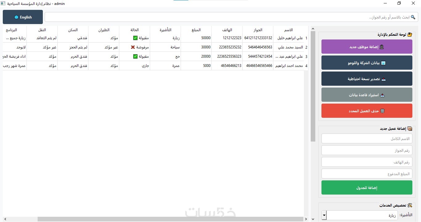 لوحة تحكم كاملة لإدارة الموظفين، الرحلات، الحالات (مقبولة/مرفوضة)، والتأشيرات.