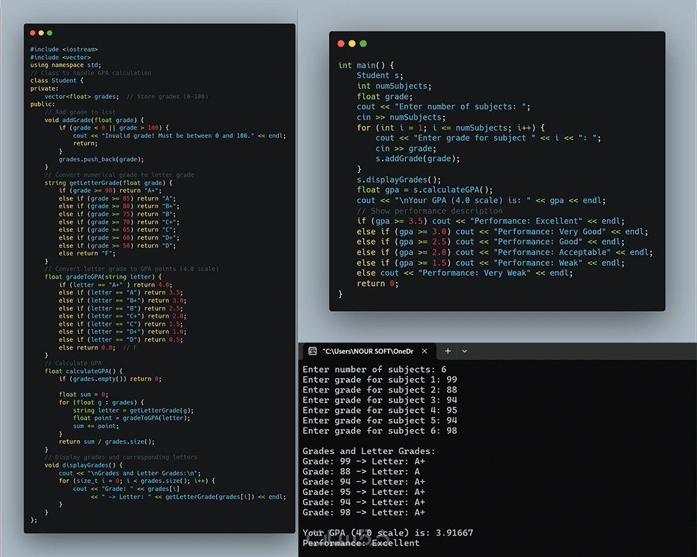 - حل مسائل وخوارزميات حتى 5–10 مسائل متدرجة الصعوبة، مع شرح منطقي واضح للكود.