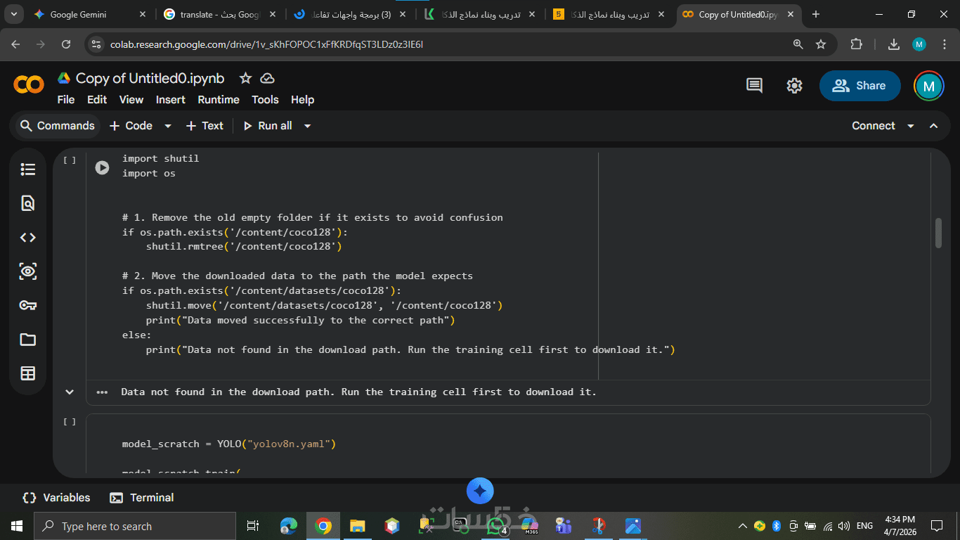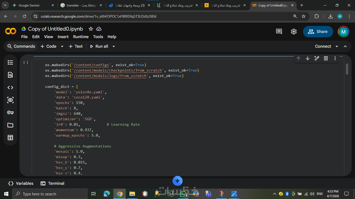 إعداد بيئة العمل وكتابة كود التدريب في ملف (Google Colab / Jupyter Notebook) منظم وموثق.