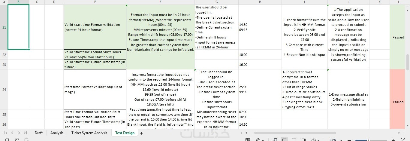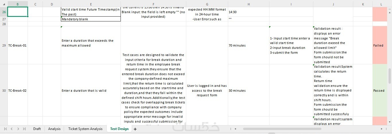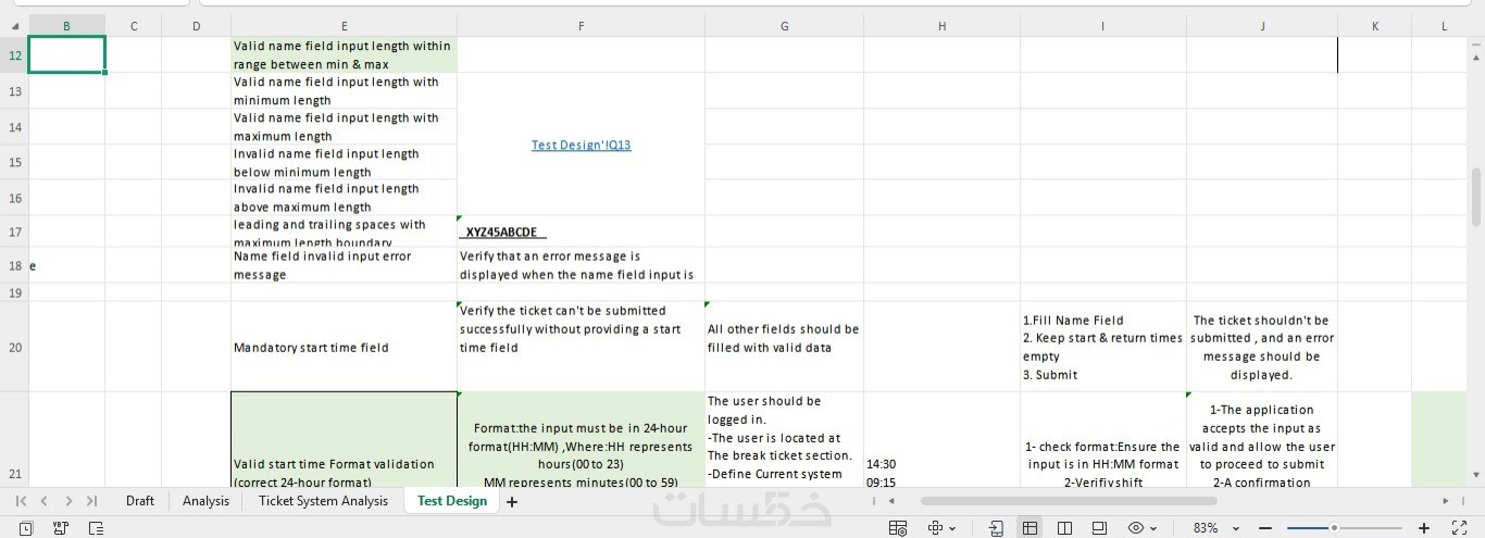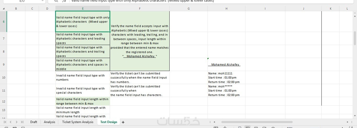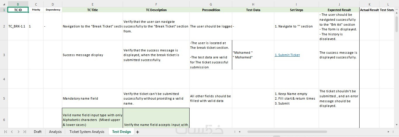 ملف يحتوي علي حالات الاختبار Test case ,Expected result ,Actual result and Bugs if there any bugs