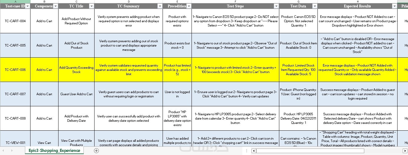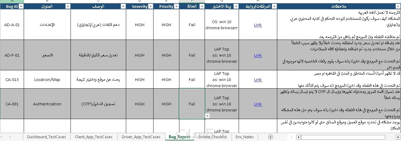 تقرير حالات الاختبار (Test Case Report) بصيغة Excel يحتوي على كل خطوات الاختبار والنتائج المتوقعة والفعلية.