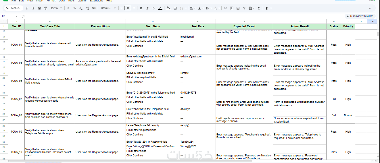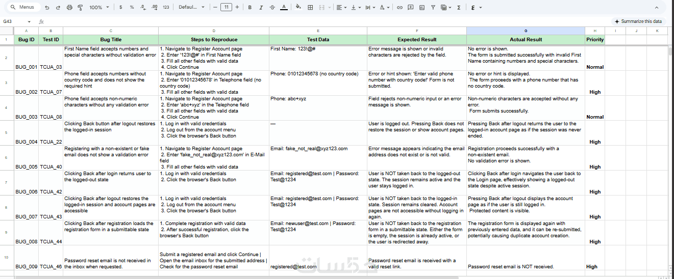 حالات الاختبار وتقرير الاخطاء سيتم تسليمها في ملف excel او google sheets او Jira حسب الطلب