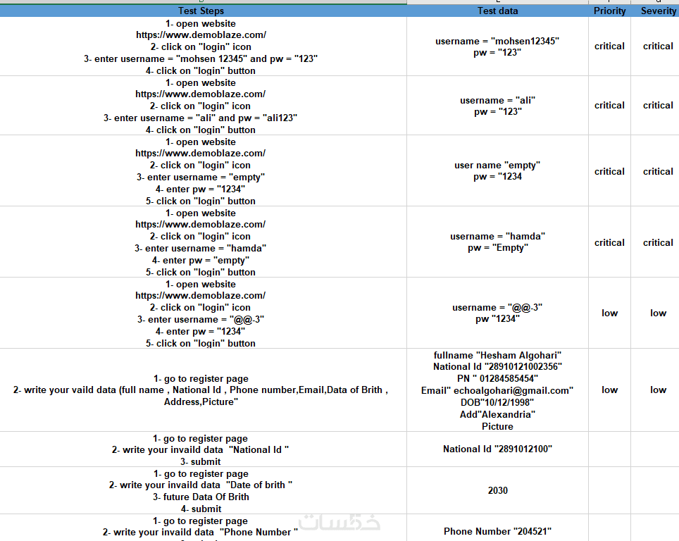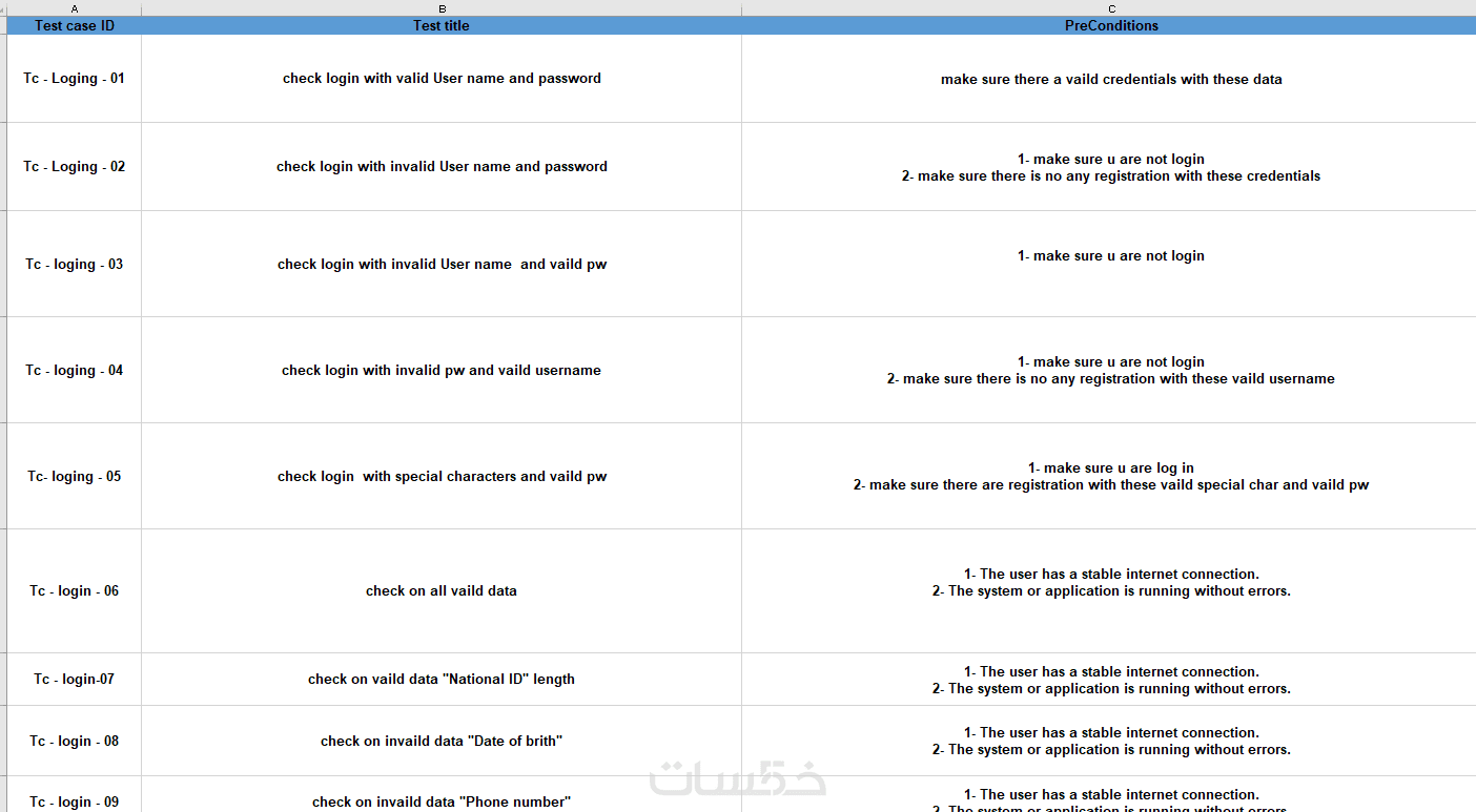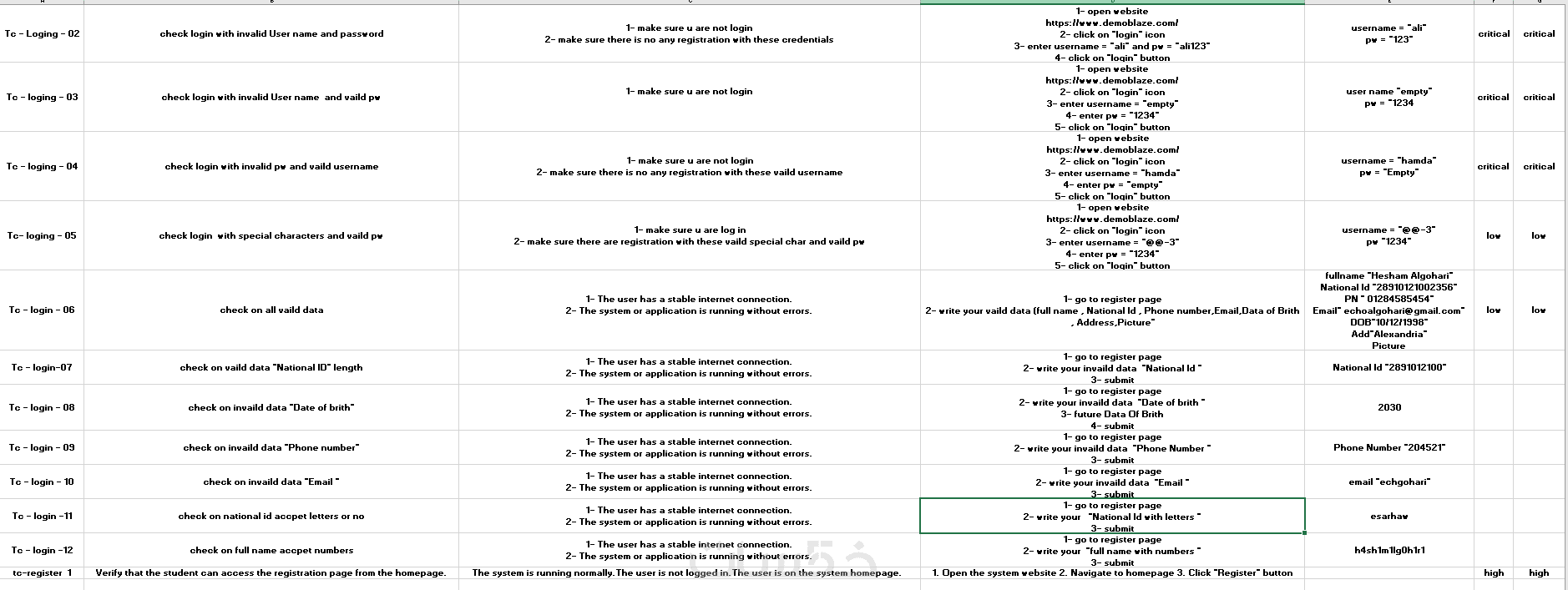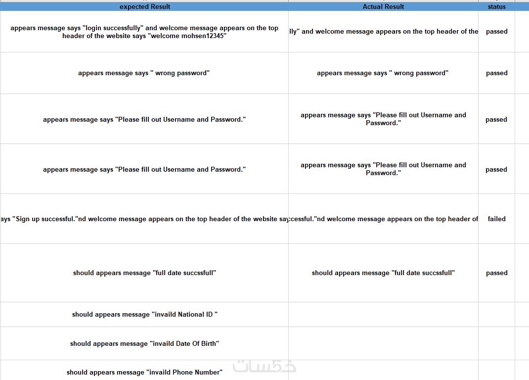 ملف (Excel أو Google Sheets) يحتوي على جميع السيناريوهات التي تم فحصها مع توضيح حالة كل منها (ناجح/فاشل).