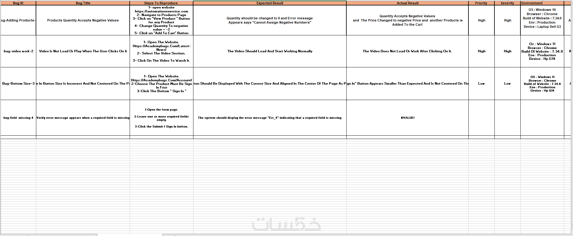 تقرير مفصل يحتوي على جميع الأخطاء المكتشفة مع شرح واضح لكل Bug وخطوات إعادة المشكلة.