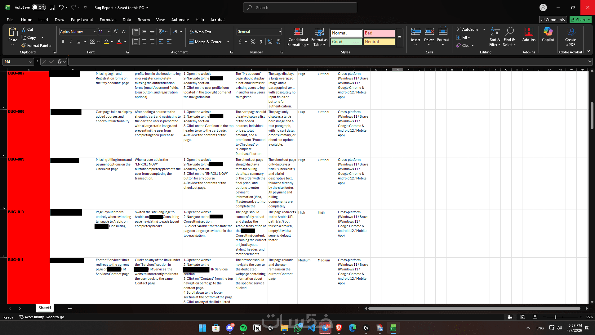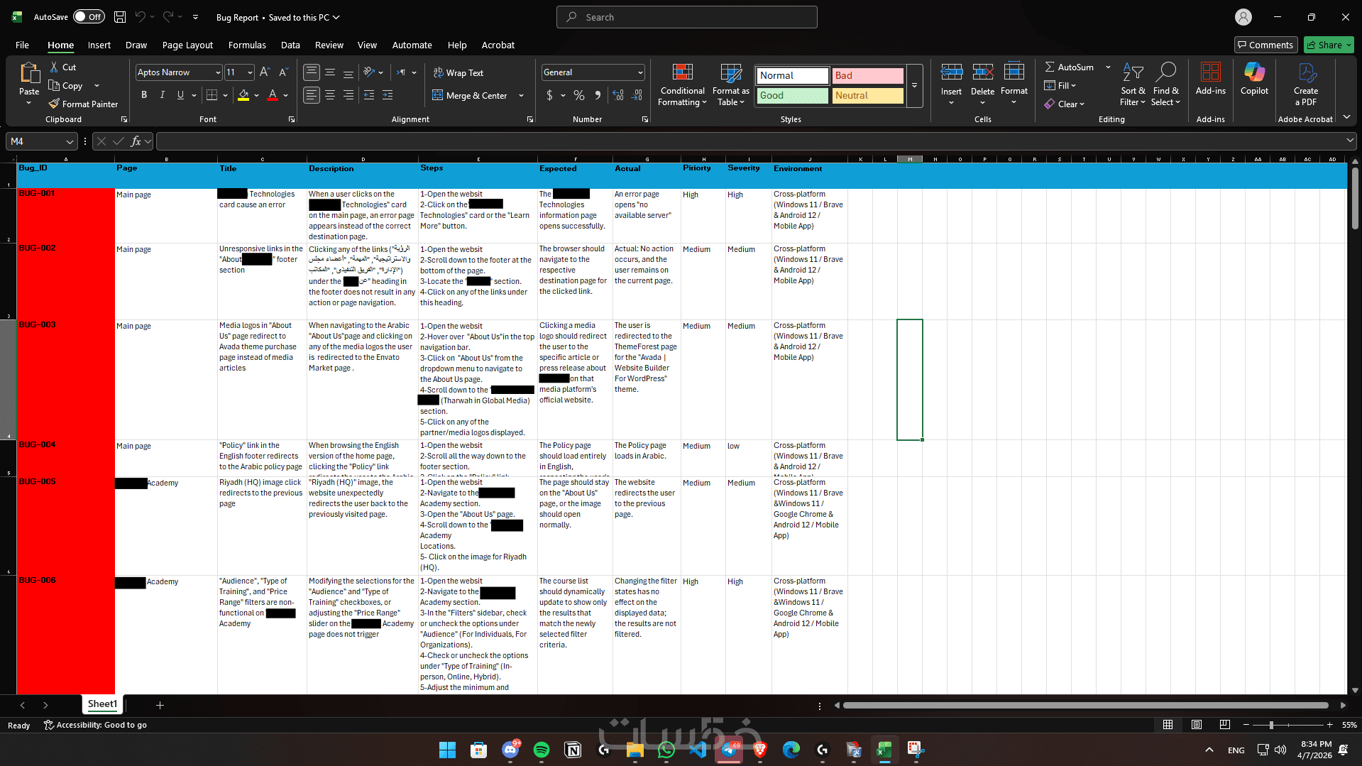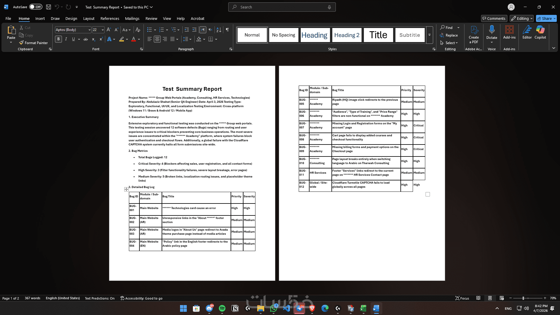 تقرير أخطاء شامل (Bug Report): تسليم ملف منظم يحتوي على كل خطأ تم إيجاده، مصحوباً بـ: مستوى خطورة المشكلة (Severity)، خطوات تكرارها (Steps to Reproduce)، النتيجة الفعلية والمتوقعة، ولقطات شاشة (Screenshots/Screen Records)