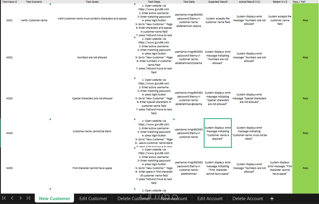 يشمل خطوات الاختبار، السيناريوهات المستخدمة، والحالة (نجاح/فشل) لكل خطوة.