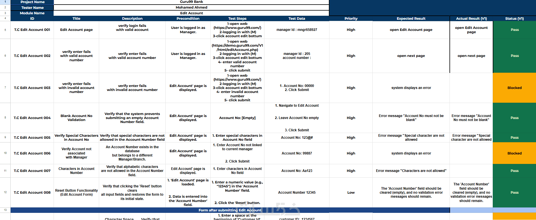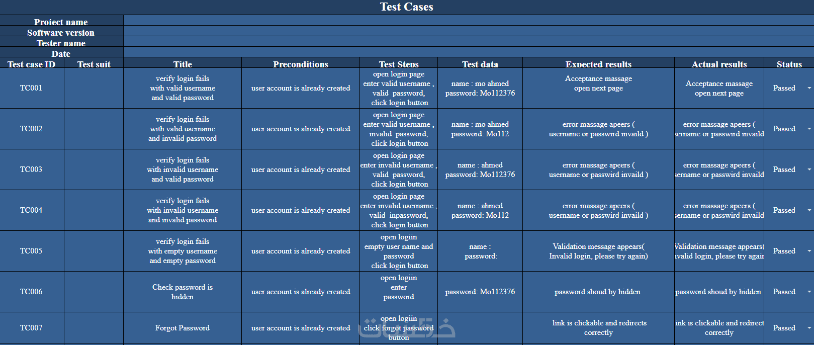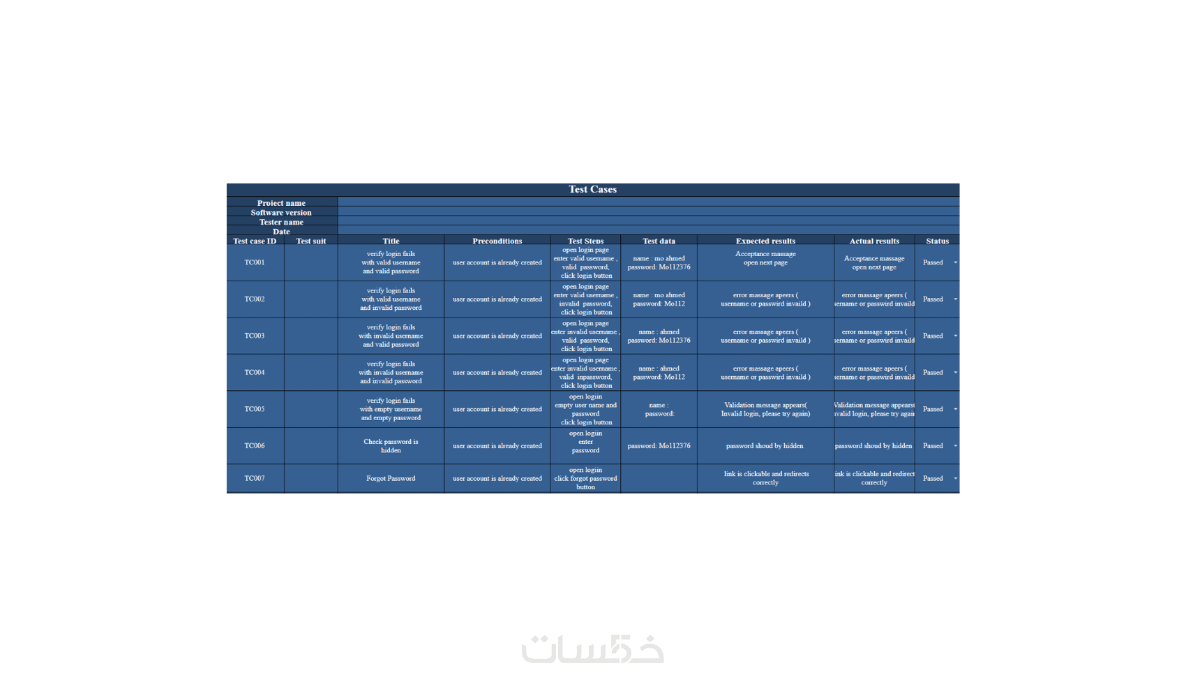 تسليم ملف يحتوي على خطوات الاختبار (Steps)، بيانات الاختبار (Test Data)، والنتائج الفعلية مقابل المتوقعة (Actual vs Expected) كما يظهر في معرض أعمالي.