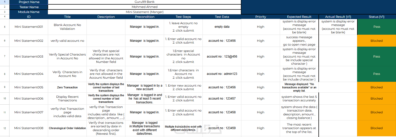 ملف (Excel أو Google Sheets) يحتوي على جميع السيناريوهات التي تم فحصها مع توضيح حالة كل منها (ناجح/فاشل).