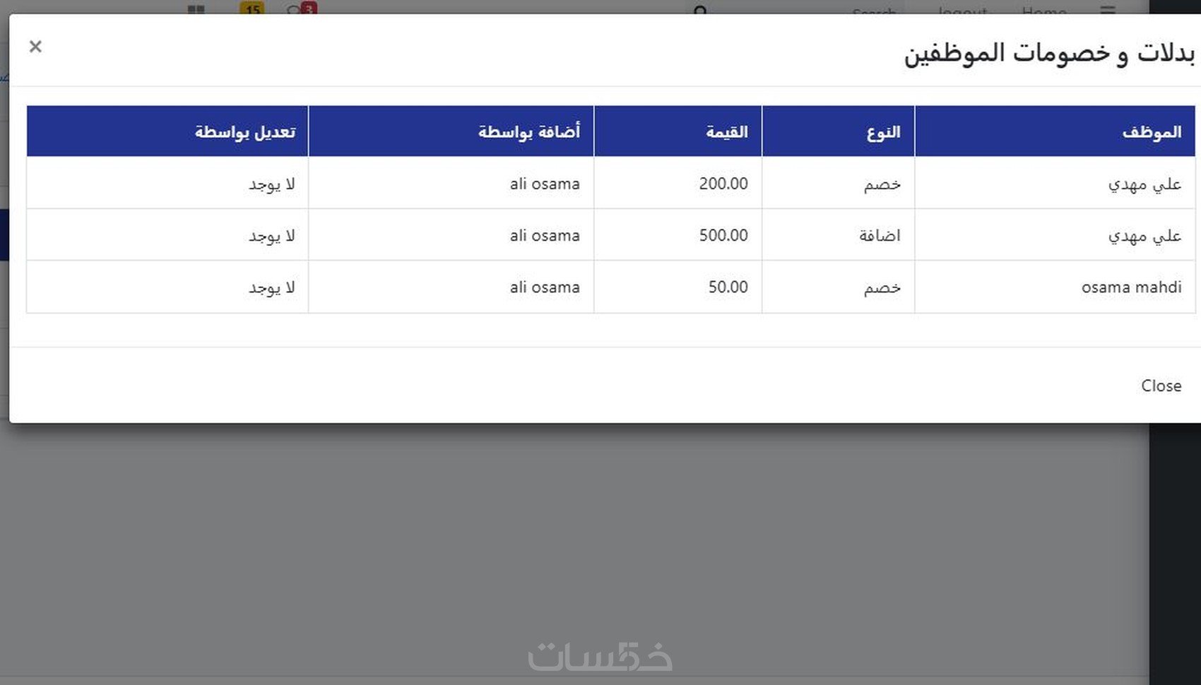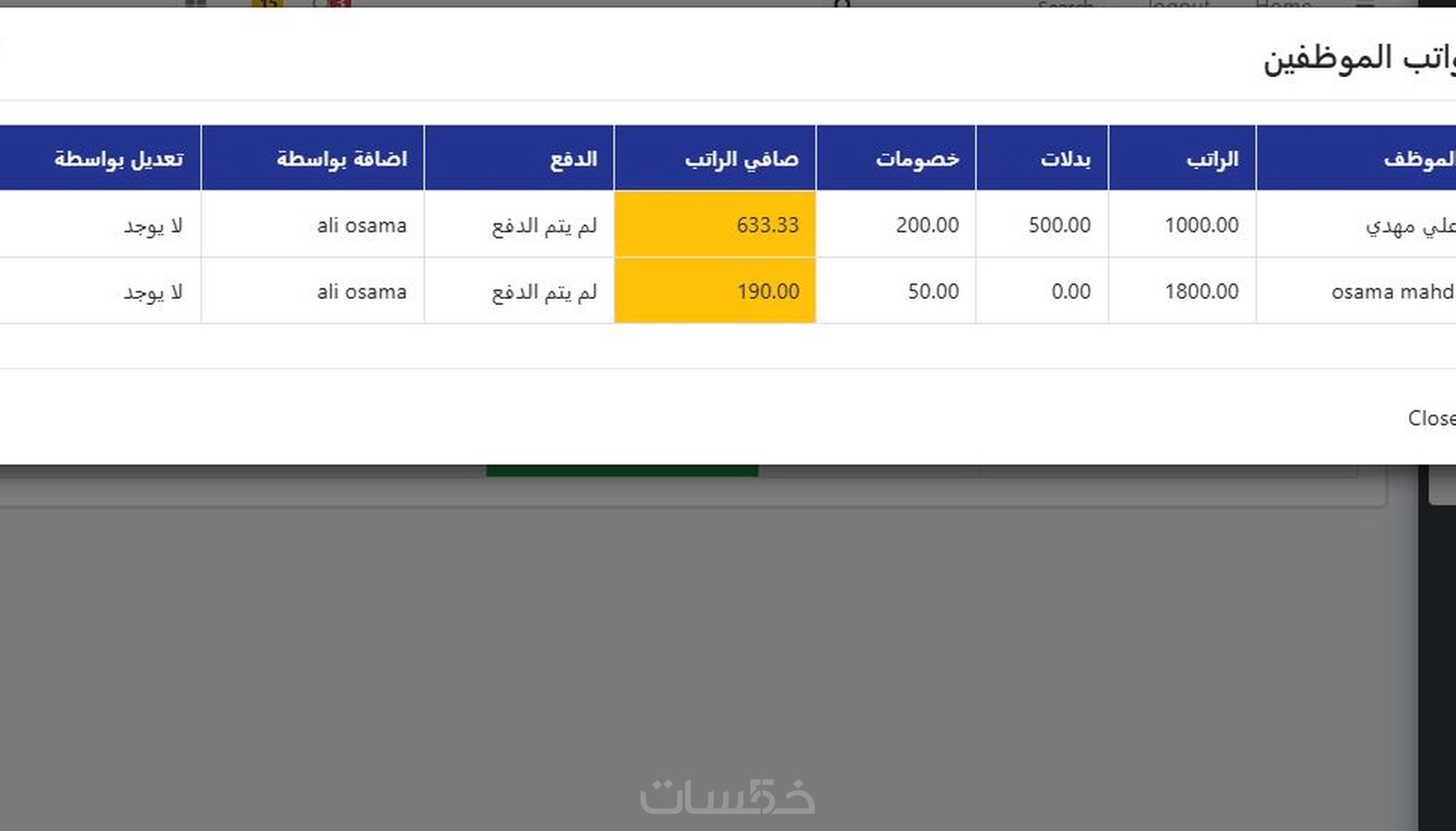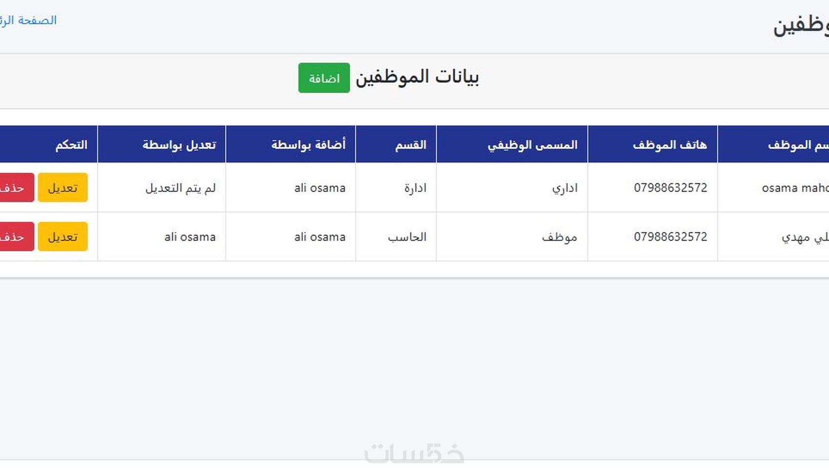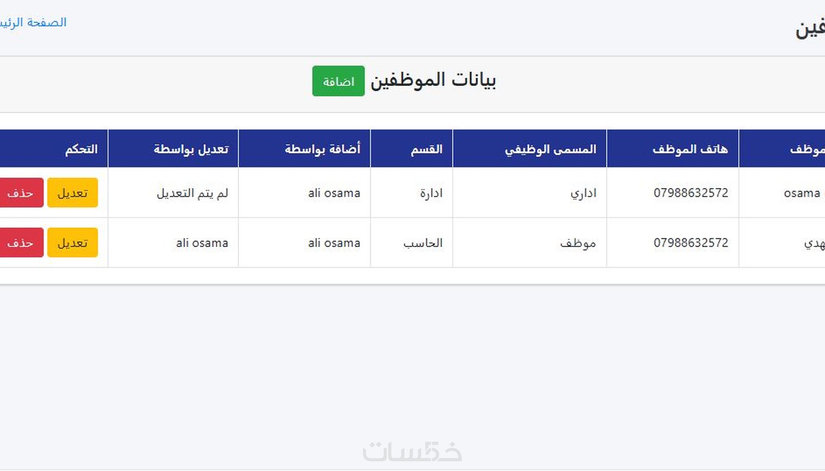 أدارة الموظفين ( من خلالها يتم استعراض بيانات الموظفين ,أضافة بيانات موظف جديد , تعديل بيانات موظف , حذف)