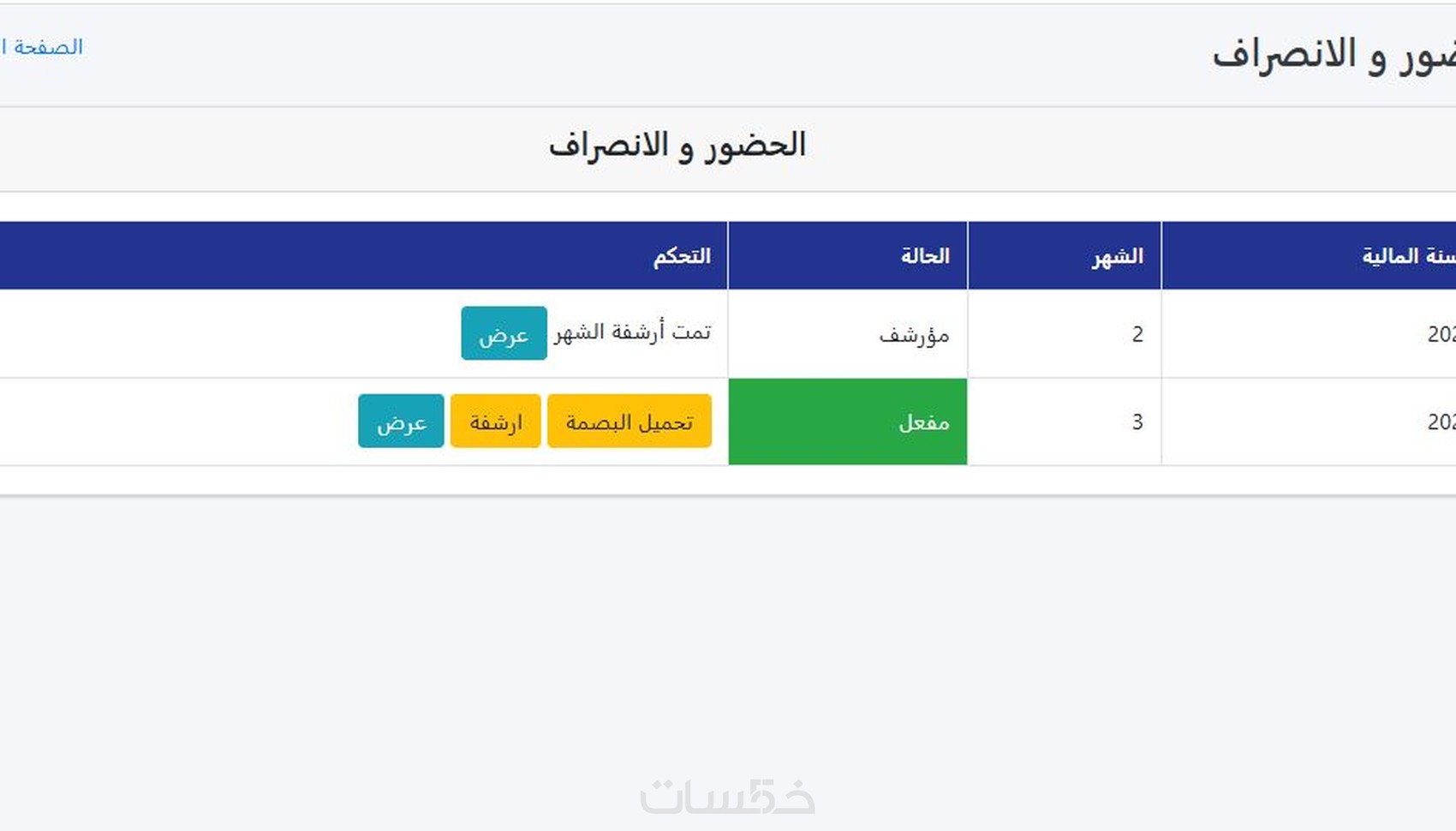 أدارة الحضور و الانصراف ( من خلالها يتم استعراض الحضور و الانصراف بناء على الشهر المالي, امكانية تحميل الحضور والانصراف من ملف excel