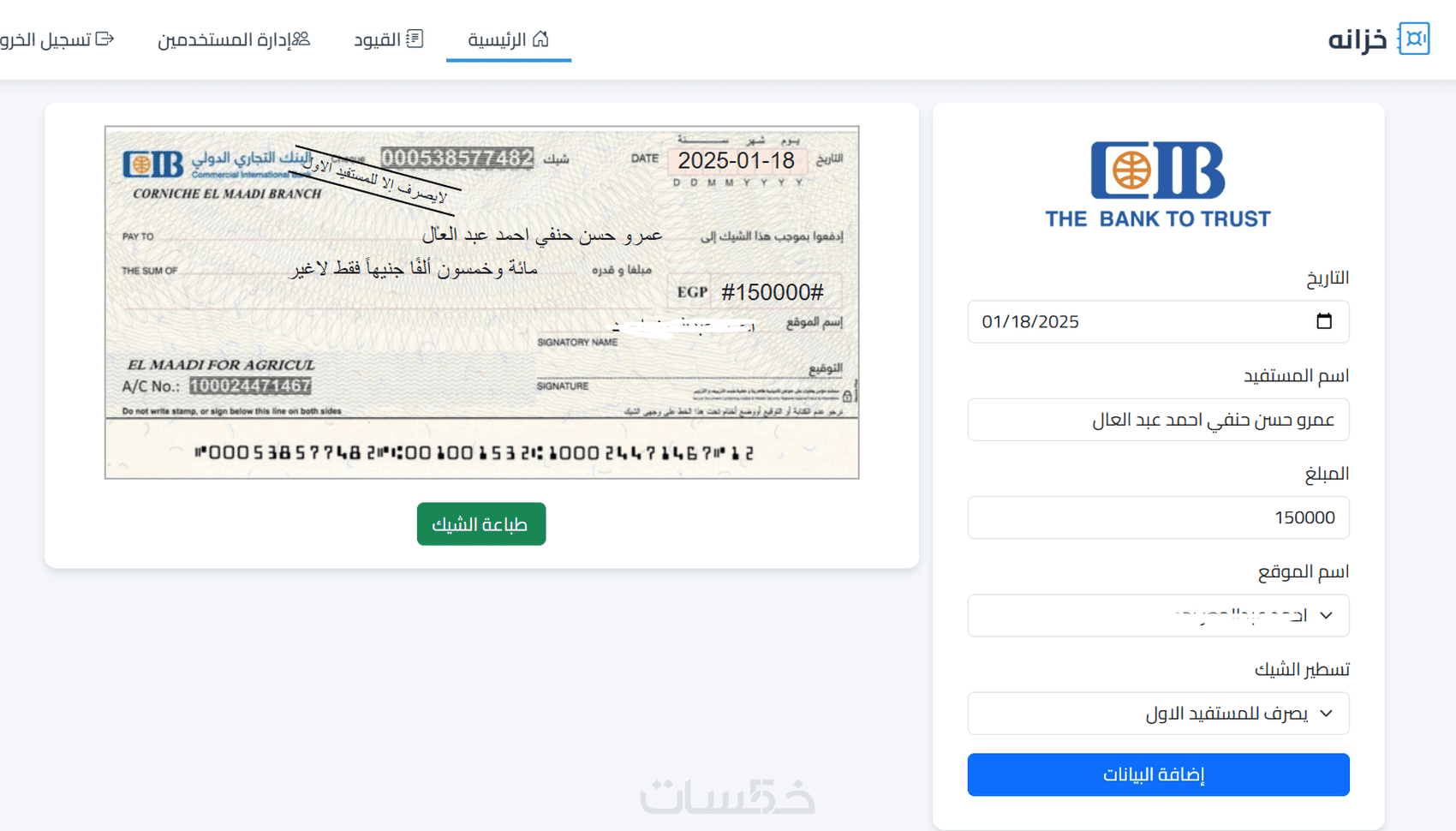 4- امكانية كتابة بيانات الشيكات البنكية وطباعتها على اوراق الشيك المعتمدة يمكنك اضافة الى 5 بنوك