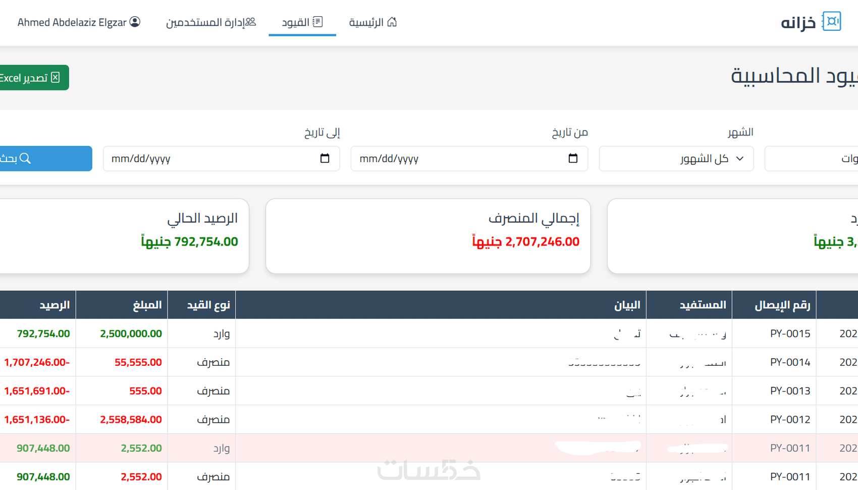 6- عرض قيود صرف وقبض النقدية مع امكانية فلترة تقرير القيد بحسب اليوم او الشهر او السنة