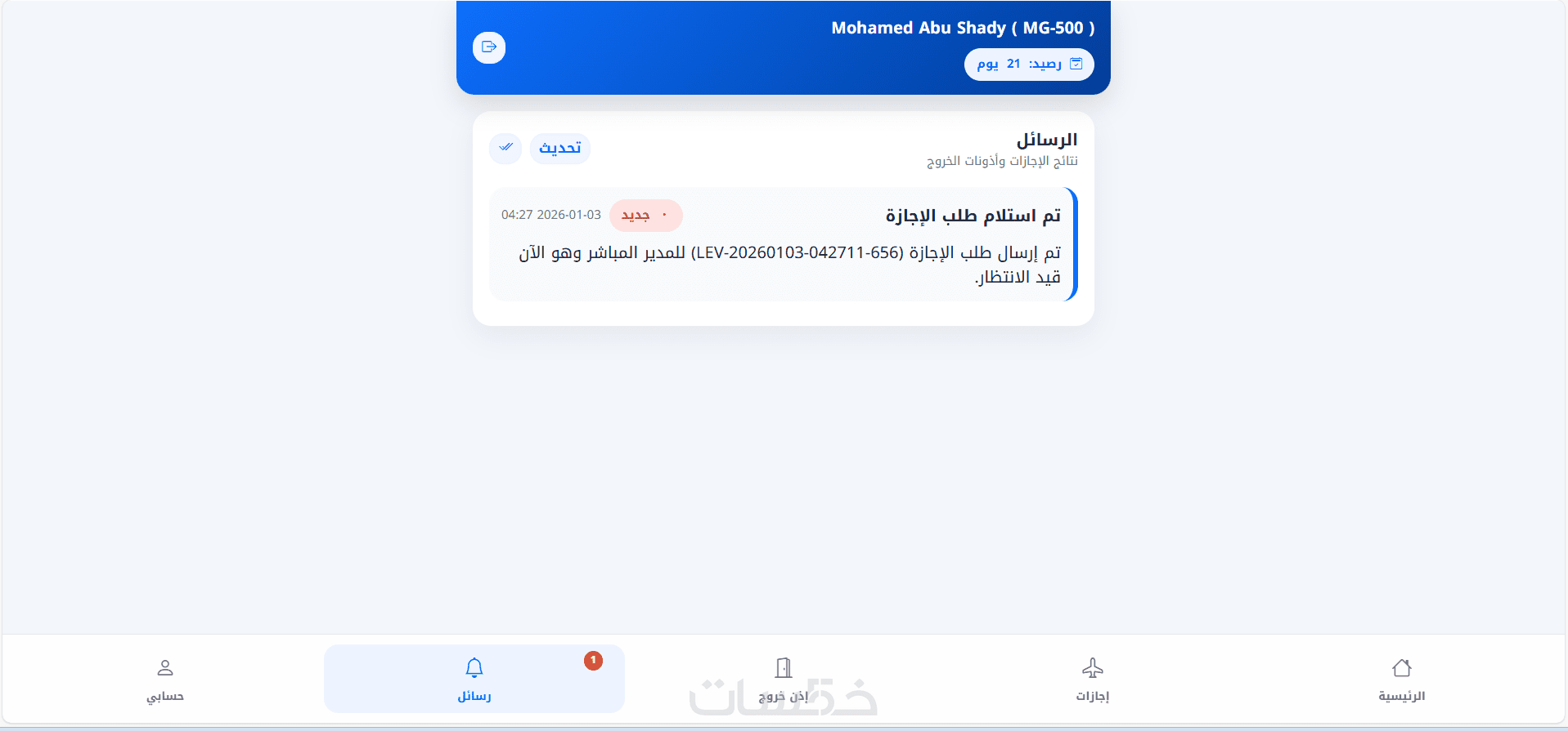 7- صفحة بيانات الموظف (الاسم – الكود – الرصيد – المدير المباشر)