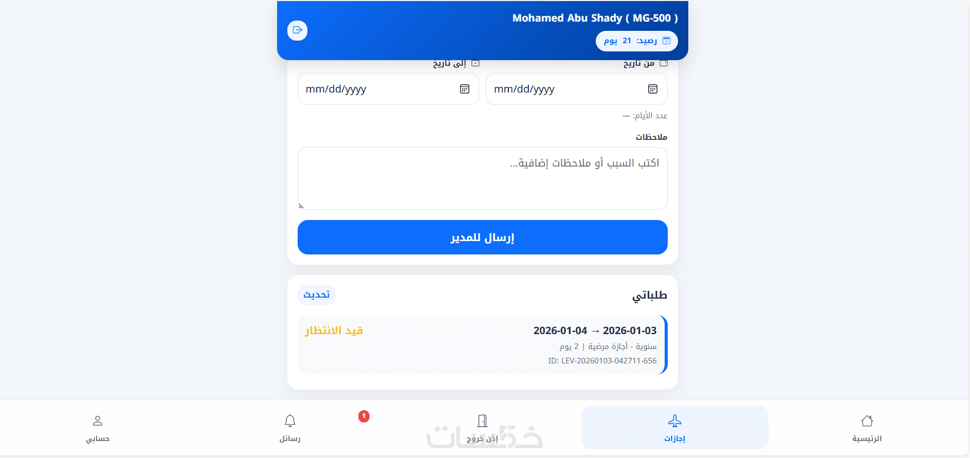 3- تقديم طلبات الإجازات مع اختيار واضح (من / إلى)