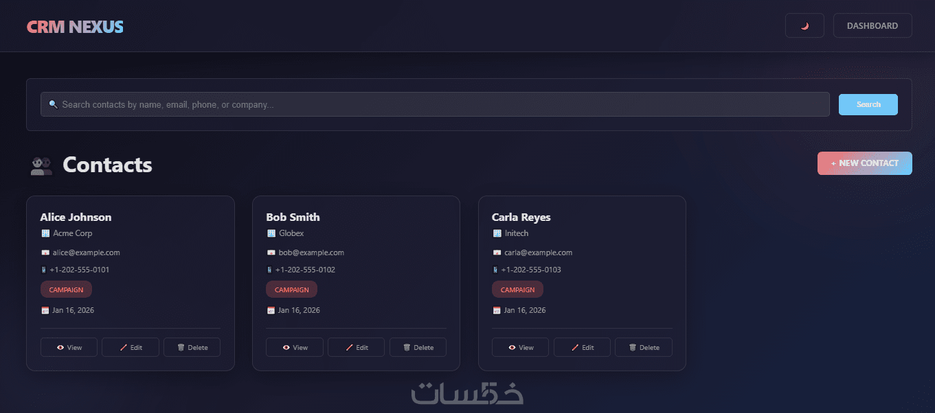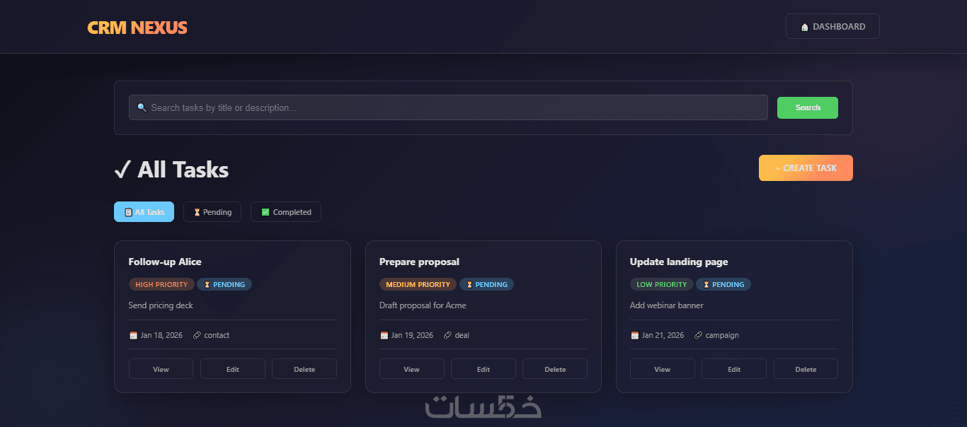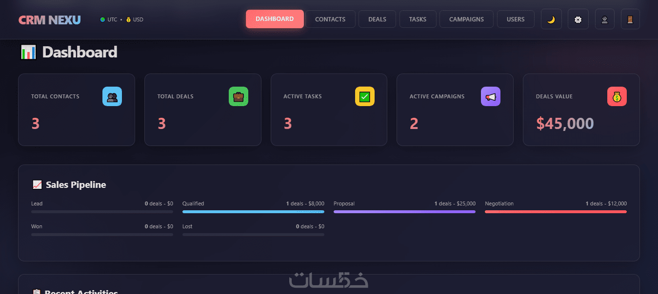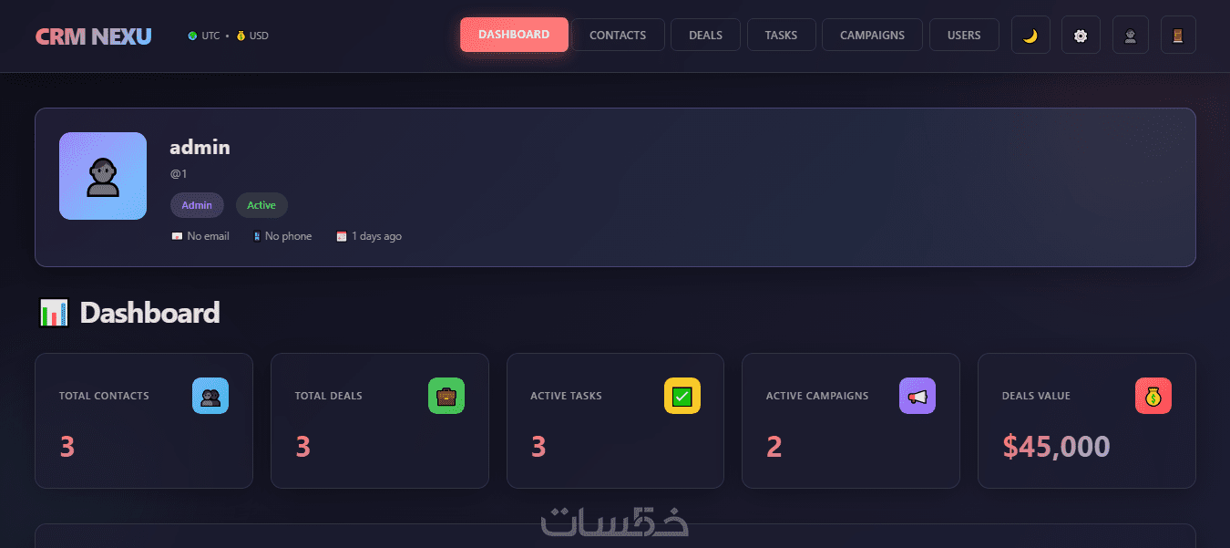الأقسام الرئيسية: 6 أقسام (Dashboard / Contacts / Deals / Tasks / Users / Reports).