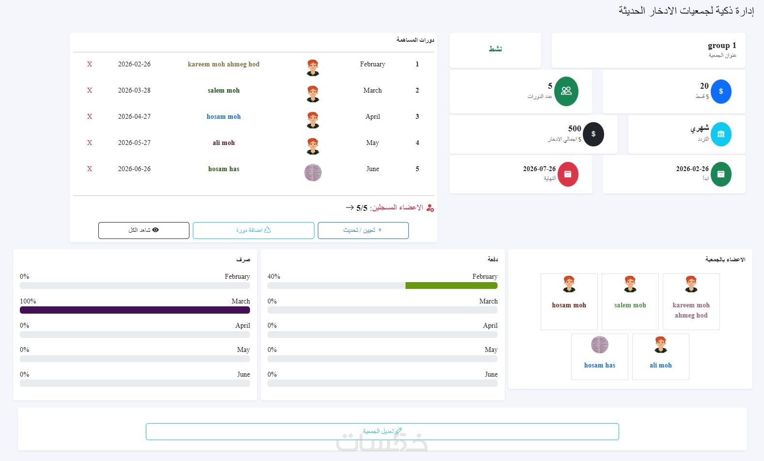 وخلال فترة الجمعية، يتم تسجيل جميع عمليات الدفع والصرف بدقة، مع إمكانية إرسال إشعارات وتنبيهات للأعضاء عبر البريد الإلكتروني لمتابعة الأقساط والمستحقات، مما يضمن تنظيمًا كاملًا وشفافية في إدارة العمليات المالية.