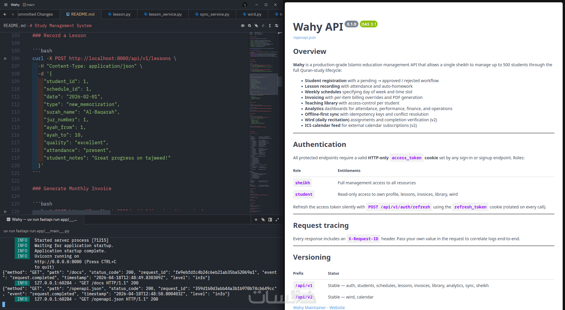 رابط (Swagger/Redoc) تفاعلي يسمح لك بتجربة كافة مسارات النظام (Endpoints) بسهولة.