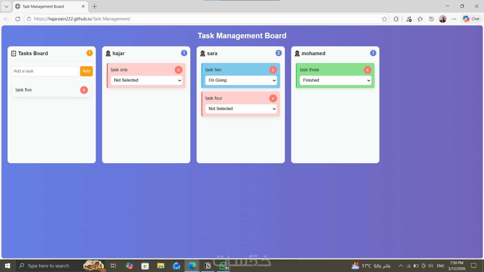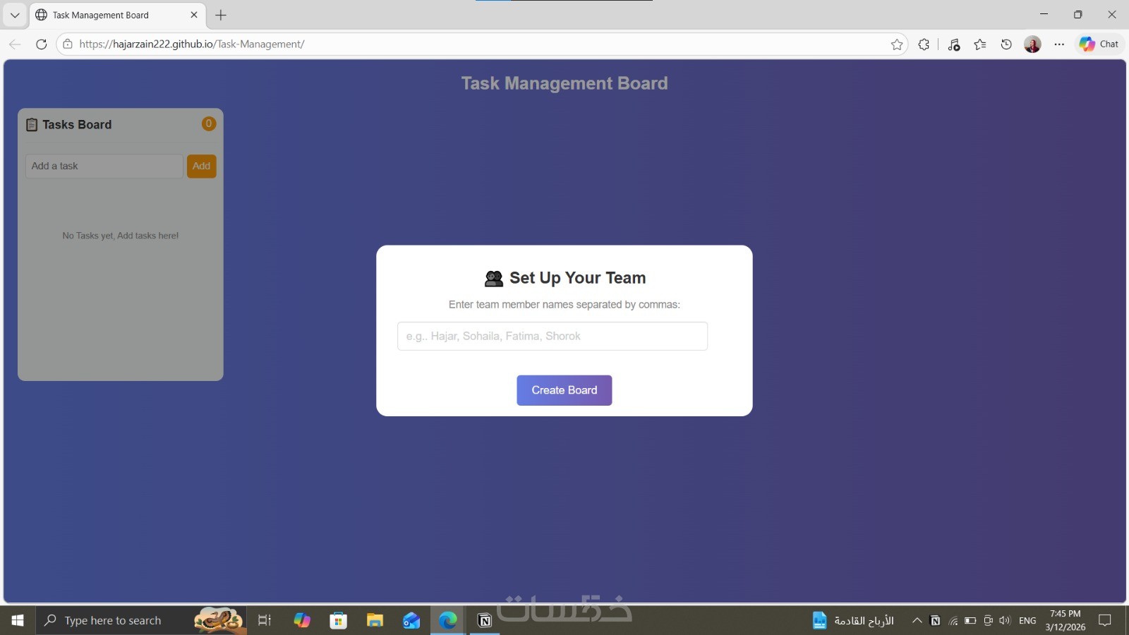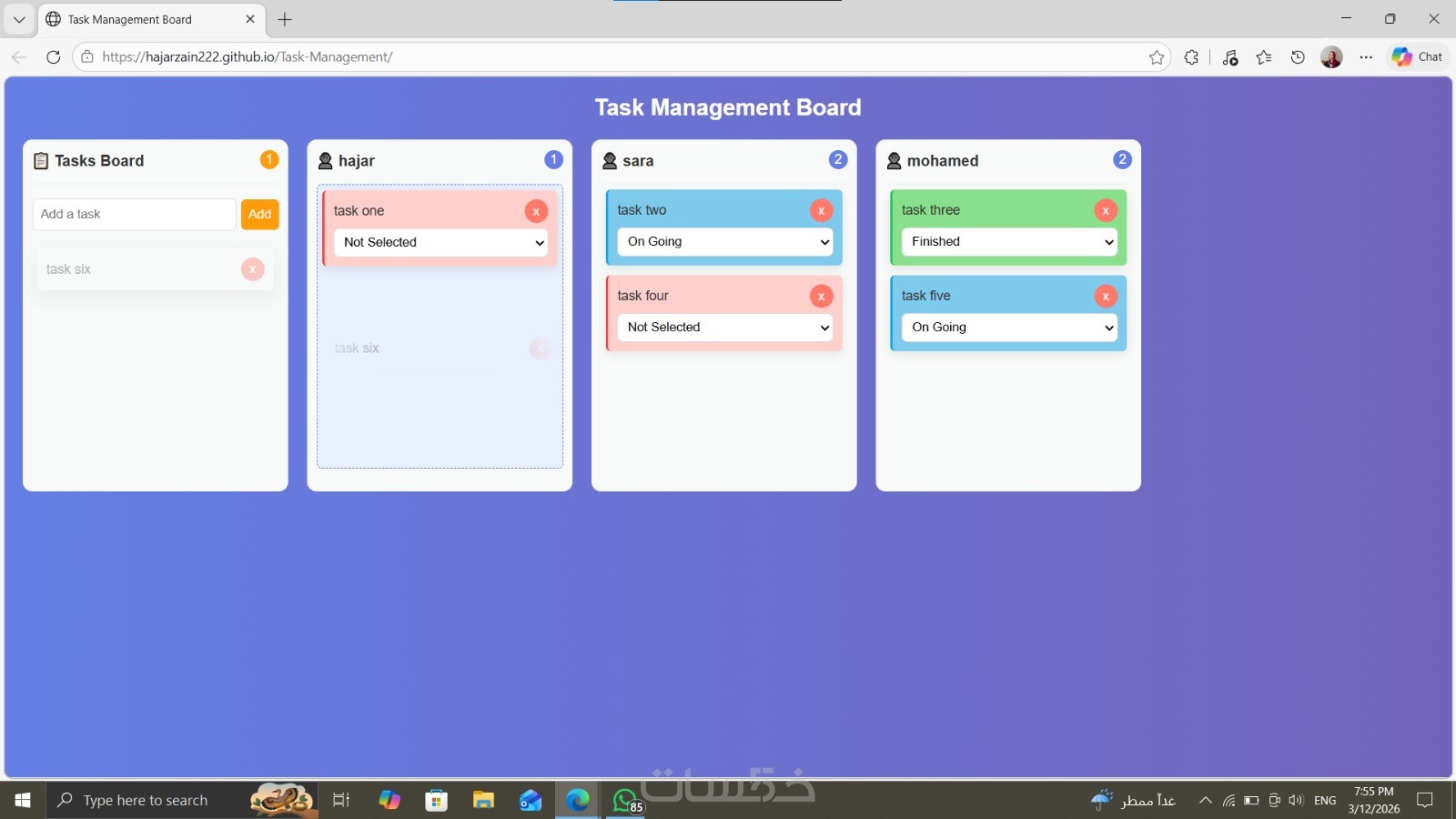 سأقوم بتطوير Task Management Board تفاعلي باستخدام HTML وCSS وJavaScript مع تصميم عصري وسهل الاستخدام يساعد على إدارة المهام وتتبع حالة العمل بسهولة.
