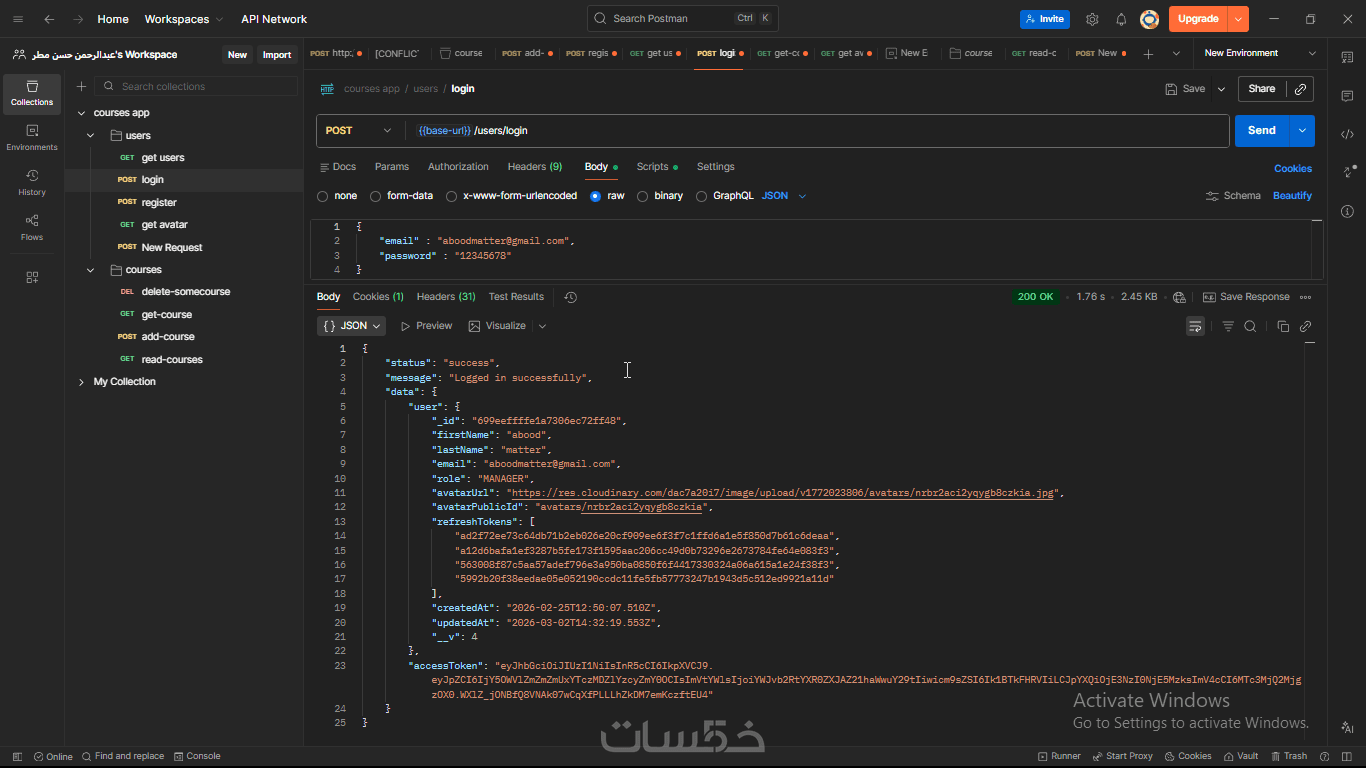 توليد Token آمن وحماية الـ Routes الحساسة باستخدام Middleware مخصص للتحقق من الصلاحيات.