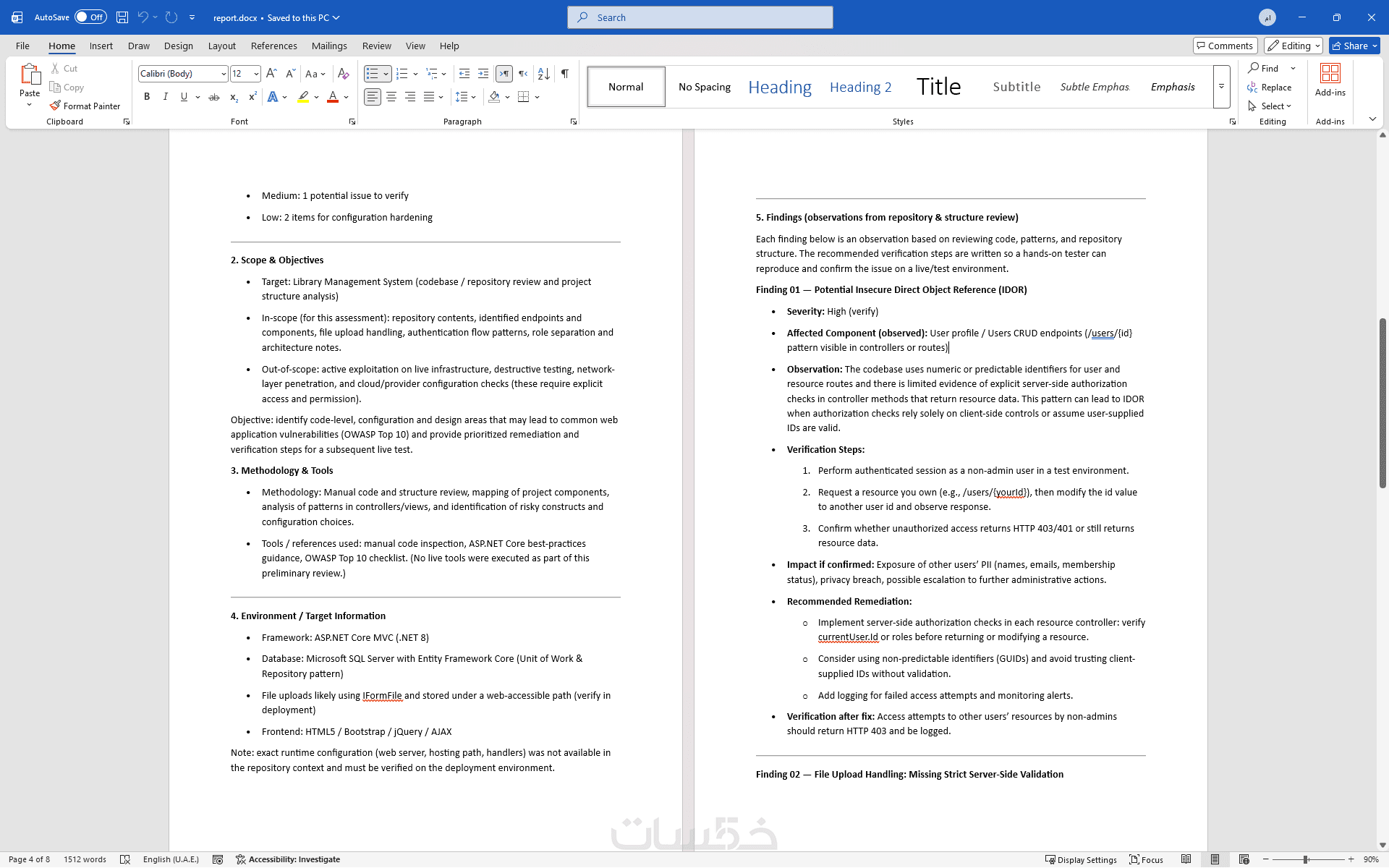 تصنيف دقيق للثغرات (حرجة، عالية، متوسطة، منخفضة) لمساعدة العميل على ترتيب أولويات الإصلاح.