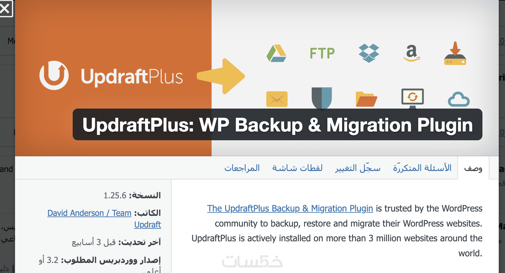 - Updraftplus لتوفير ميزات النسخ الاحتياطي والتحكم بخصائصه إضافة إلى التخزين السحابي مثل Google Drive أو Amazon S3 أو دروب بوكس.