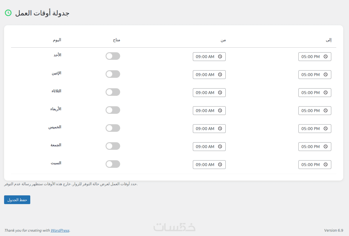 2. جدولة ذكية: ضبط ساعات العمل وتحويل الحالة تلقائيًا خارج الأوقات.