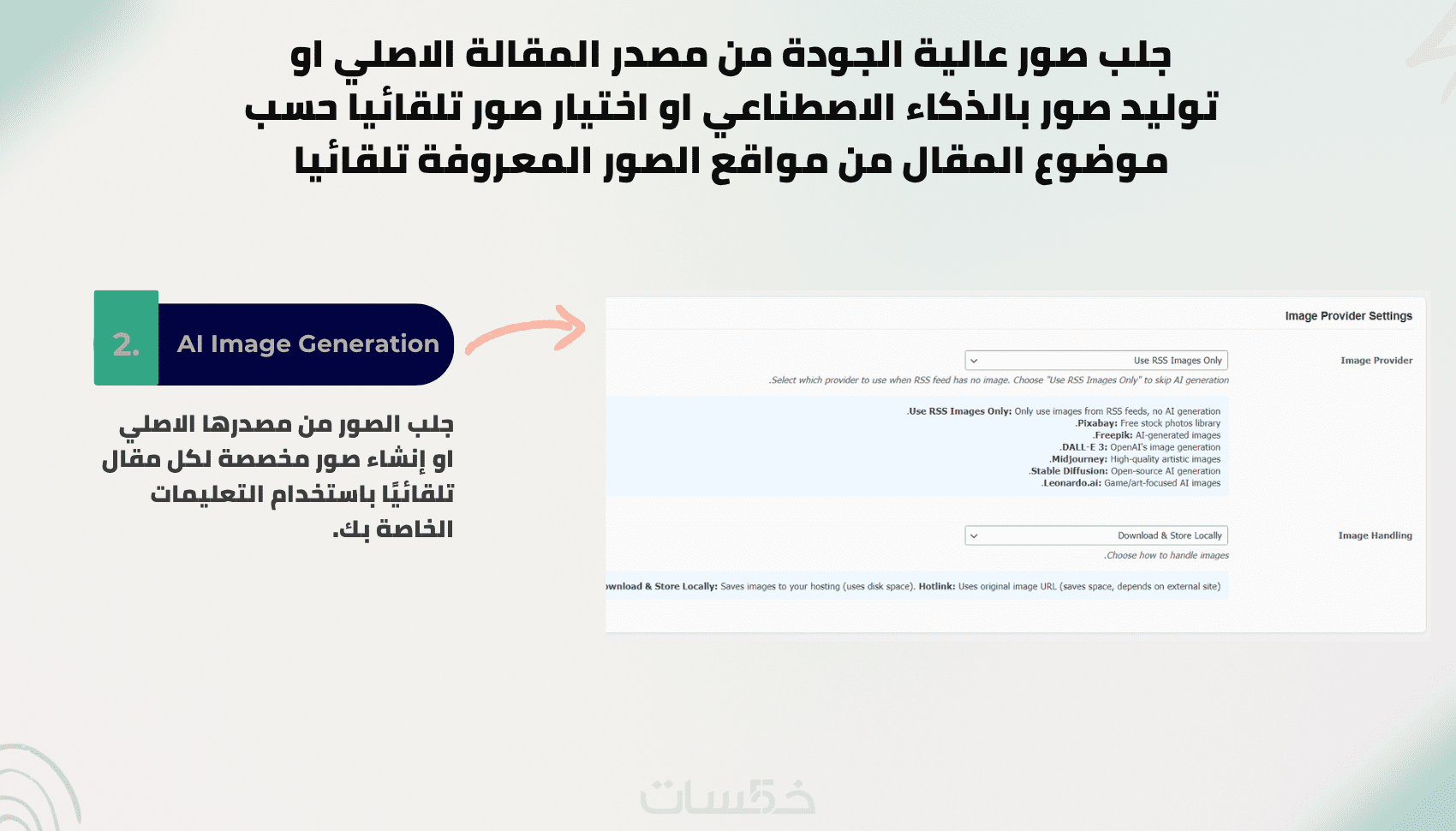 - يمكنك استعمال صورة الاصلية او توليد صورة فريدة بالذكاء الاصطناعي باستخدام التعليمات (Prompt) الخاصة بك لكل مقال تلقائيا.