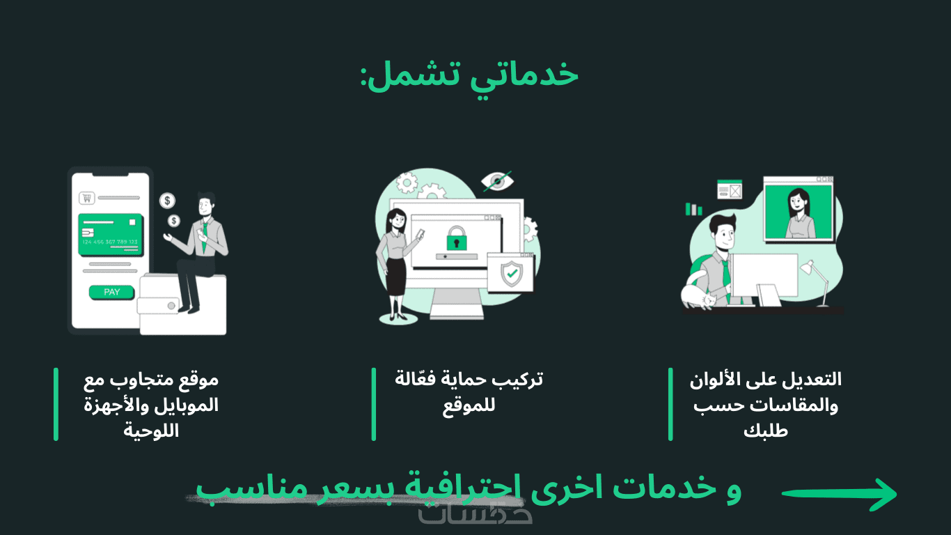 الخدمة تشمل تصميم اربع صفحات: الرئيسية + من نحن+ اتصل بنا + صفحة من اختيارك.