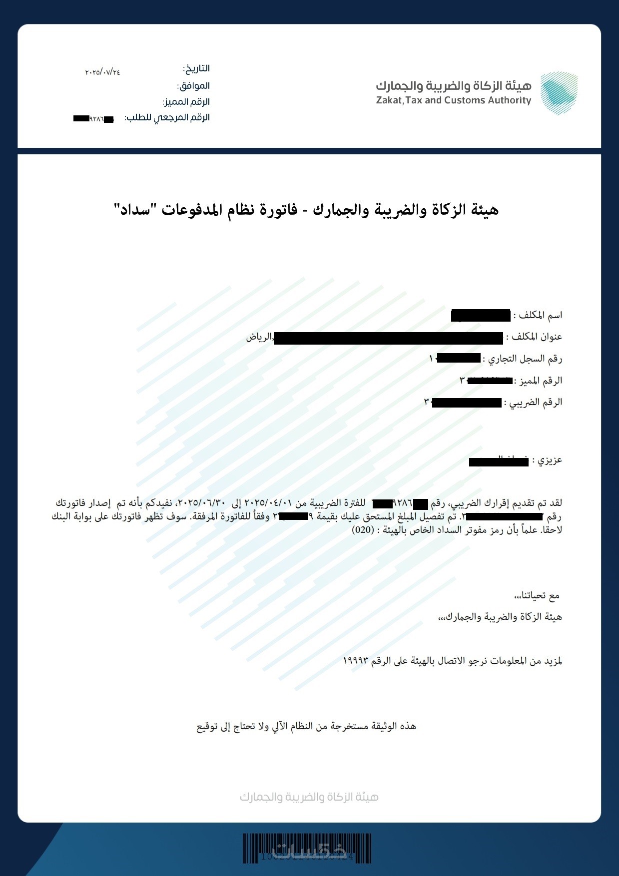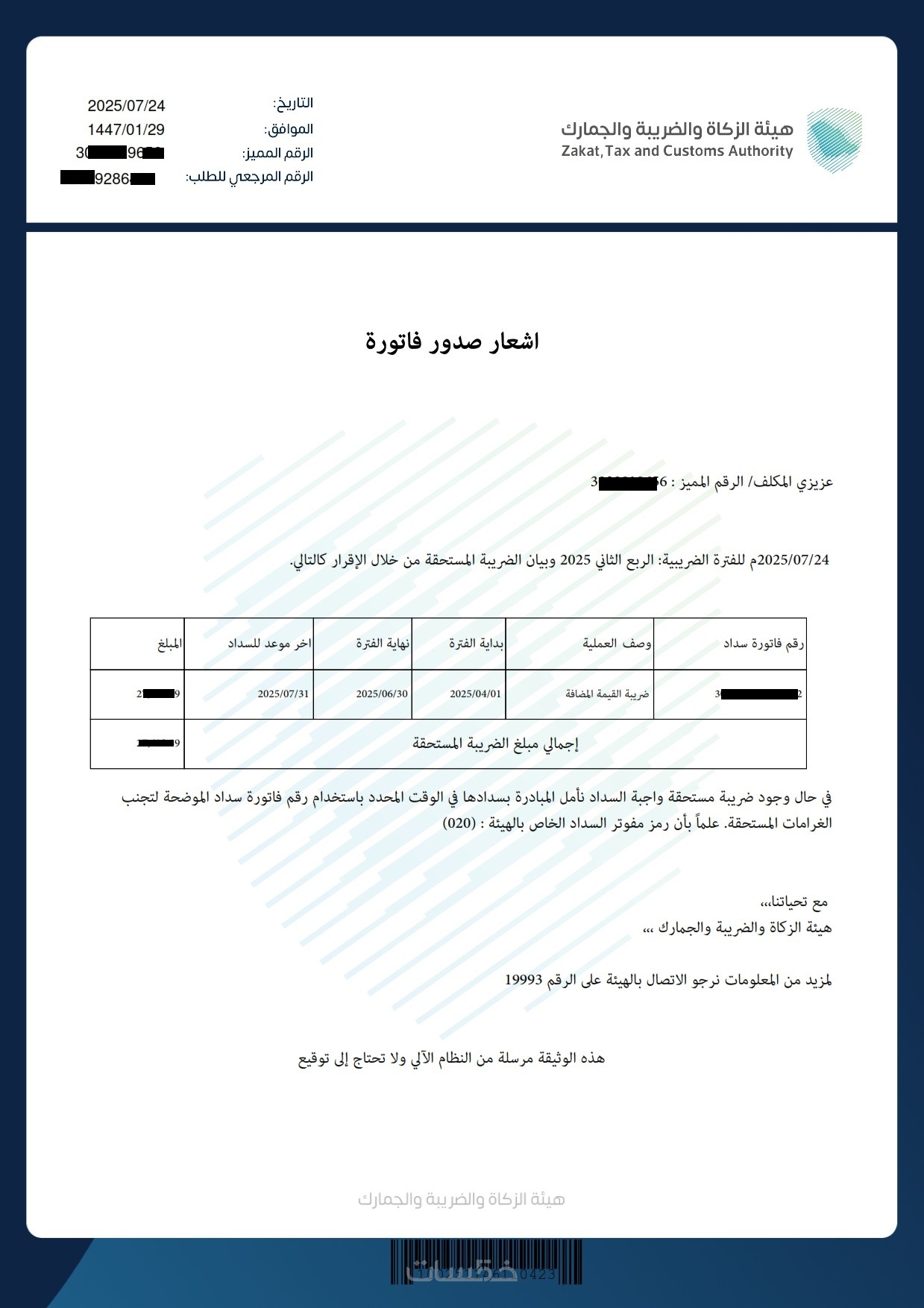 فاتورة متوافقة مع هيئة الزكاة والضريبة والدخل في السعودية
