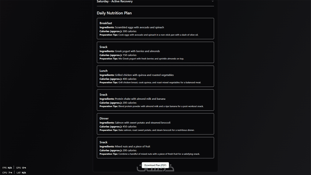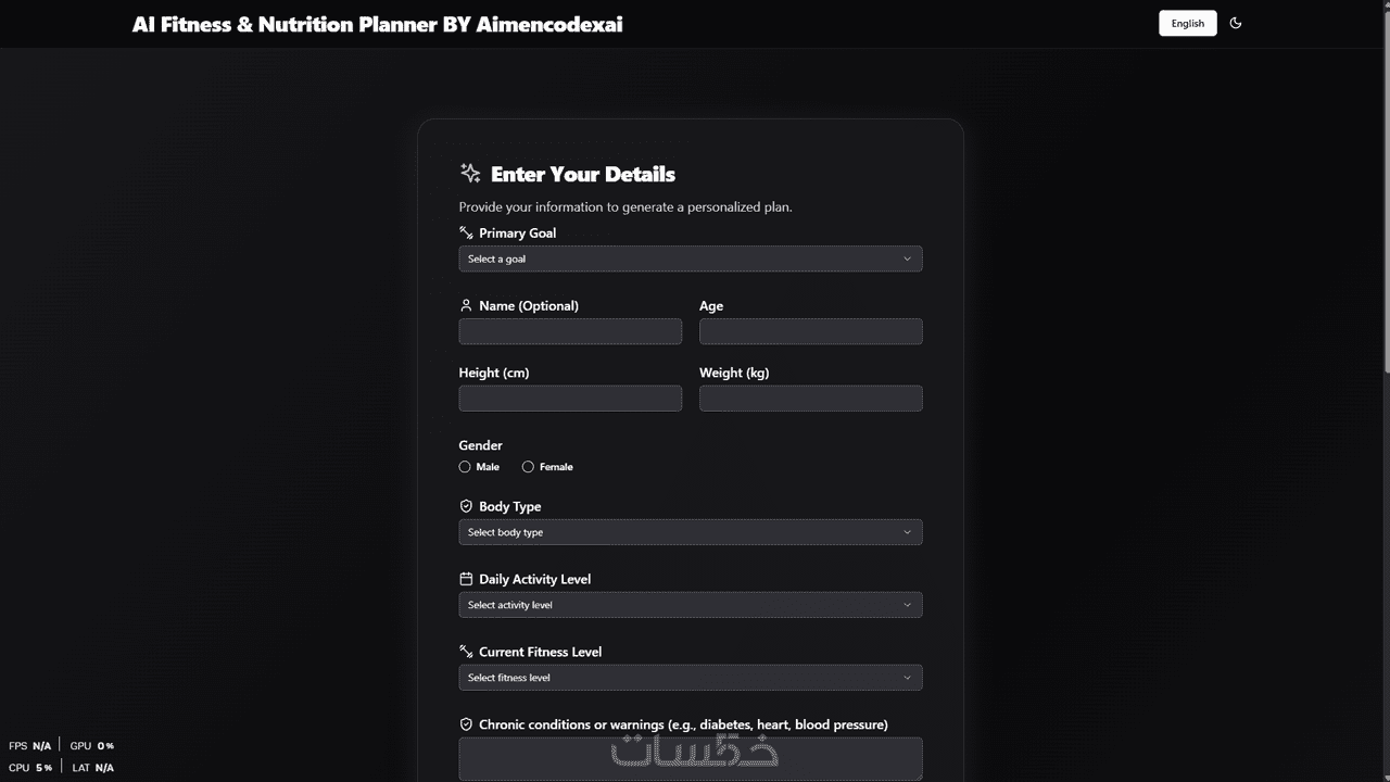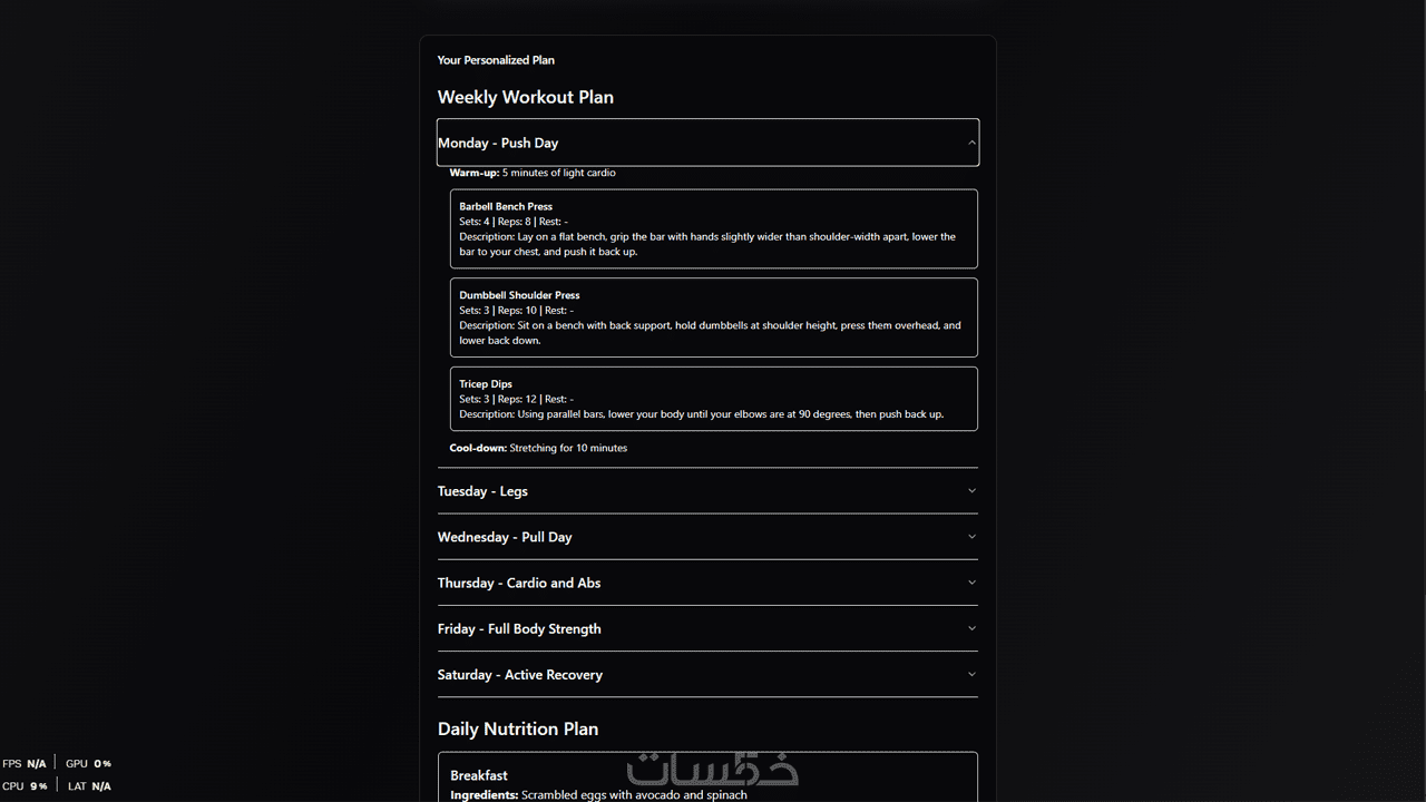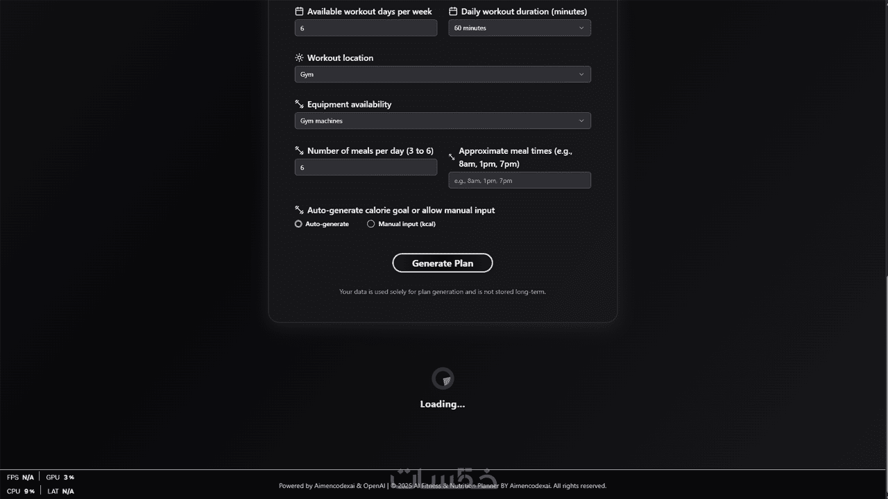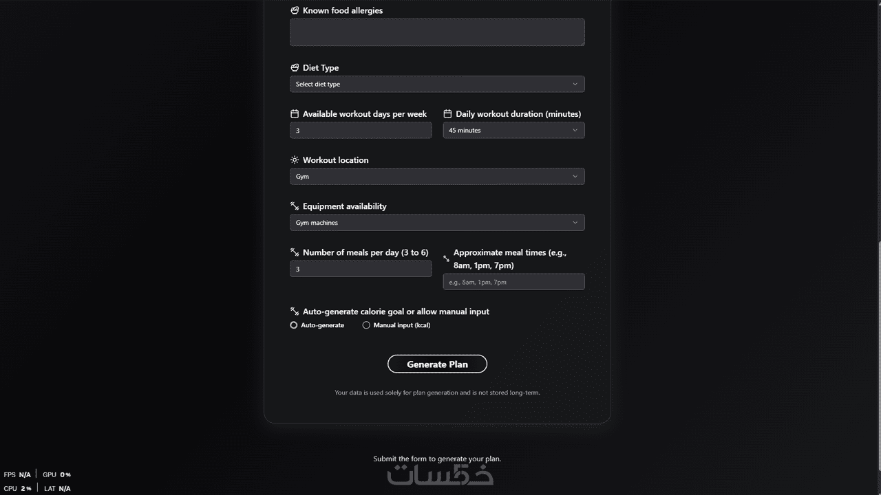 سأصمم لك موقع ذكاء اصطناعي لتوليد خطط تغذية وتمارين مخصصة
