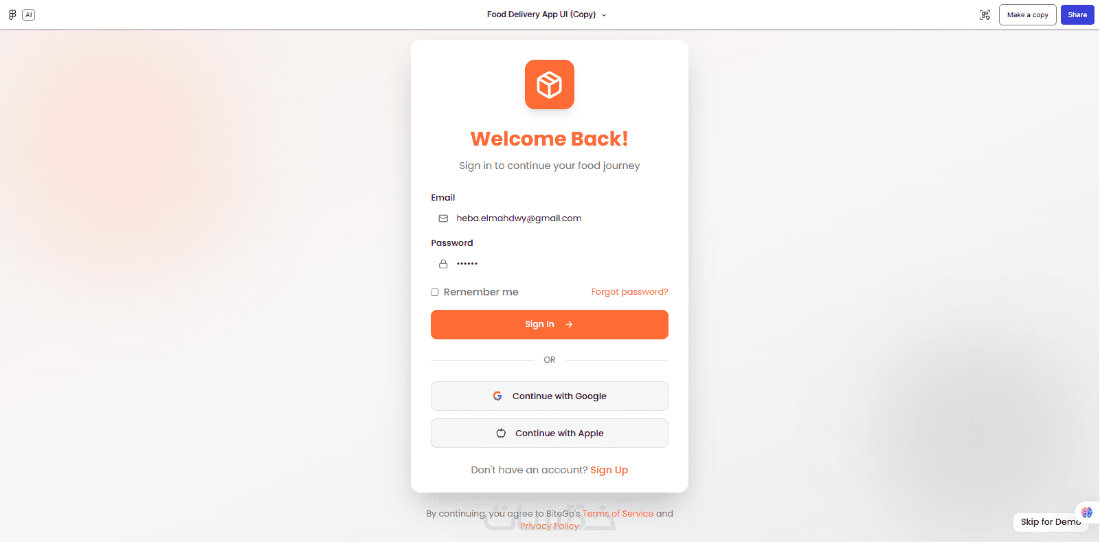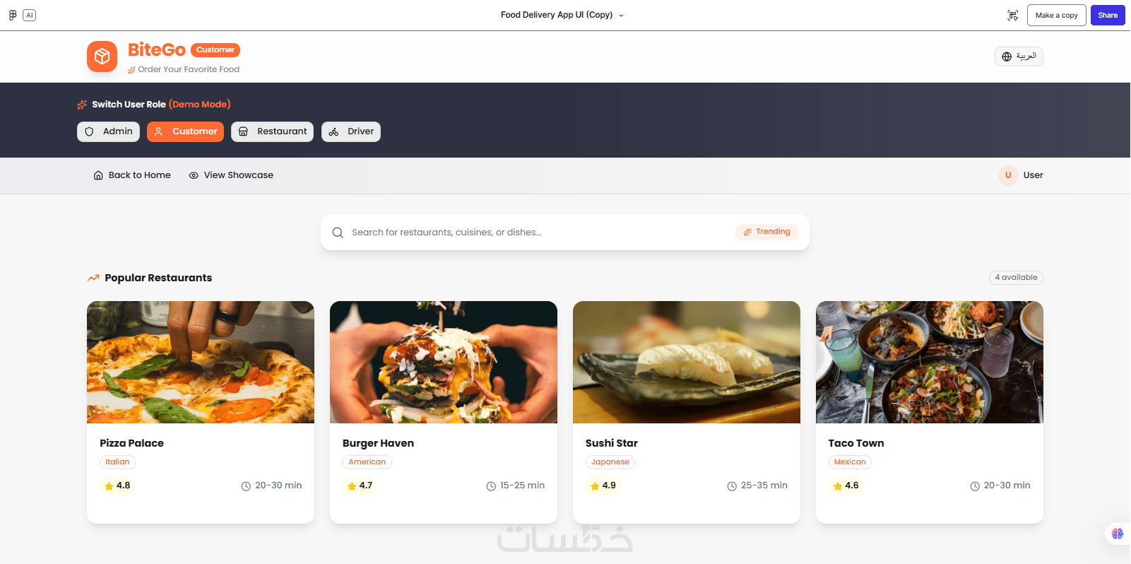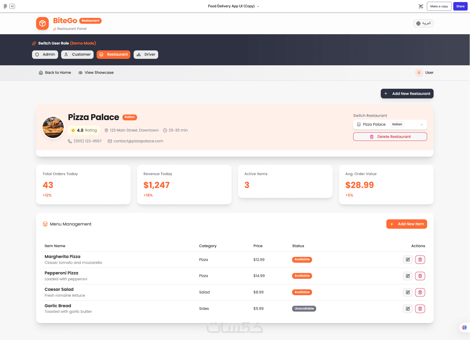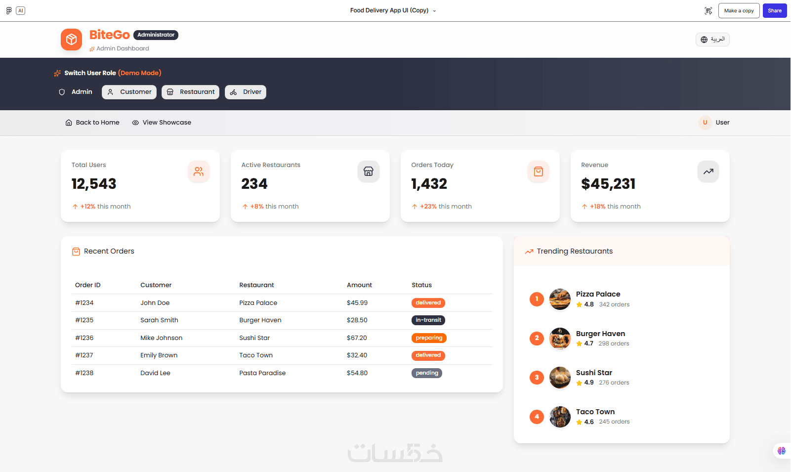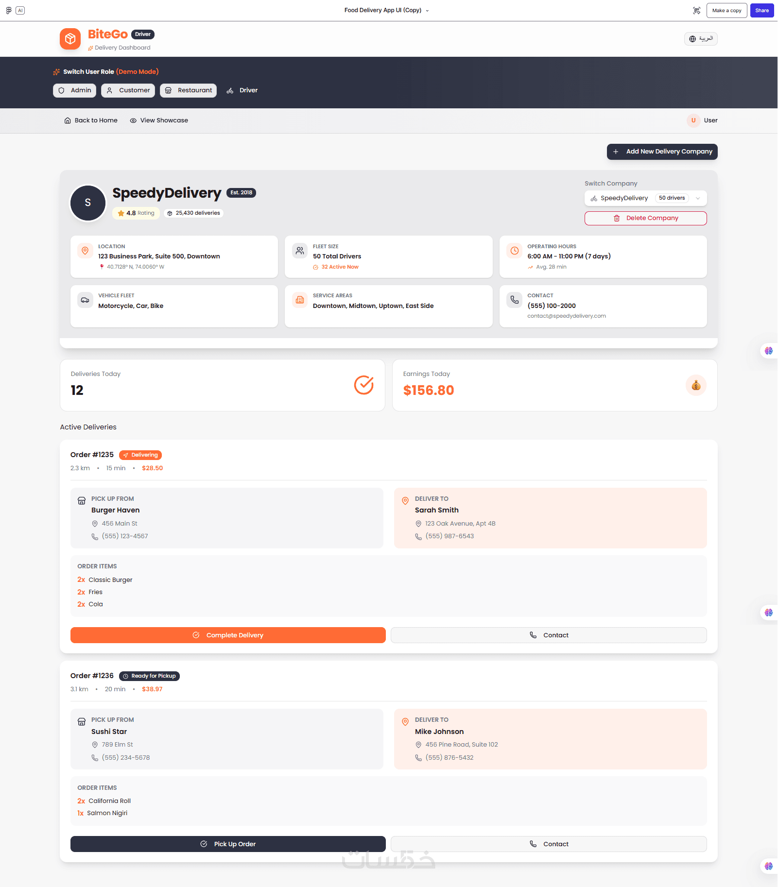 تصميم واجهات تطبيق ولوحات تحكم منصة توصيل الطعام - BiteGo