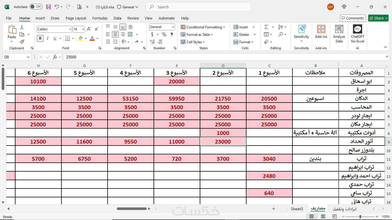 ملف اكسل لحساب تكاليف المشروع متضمن حساب ساعات التشغيل
