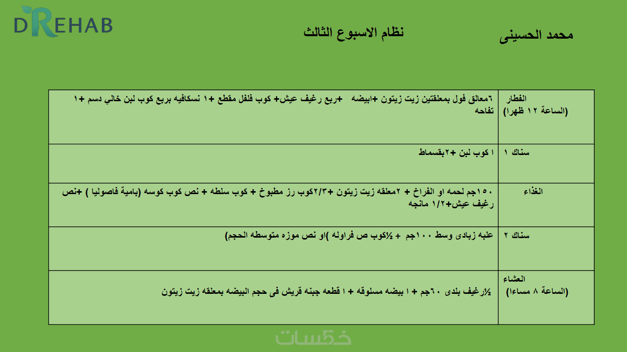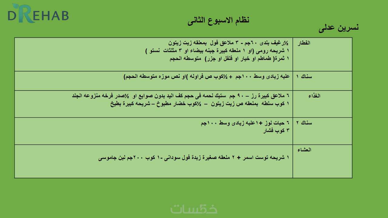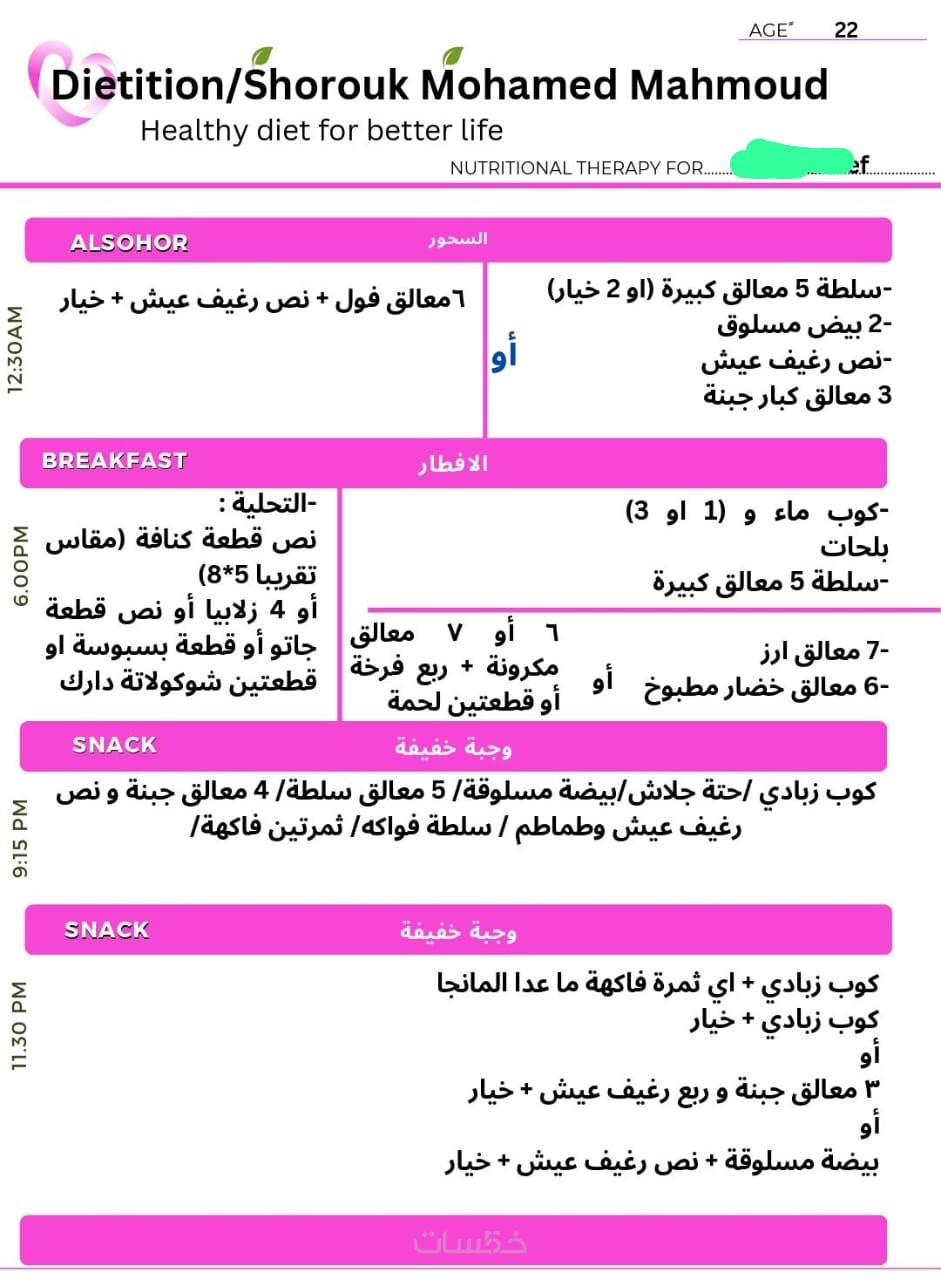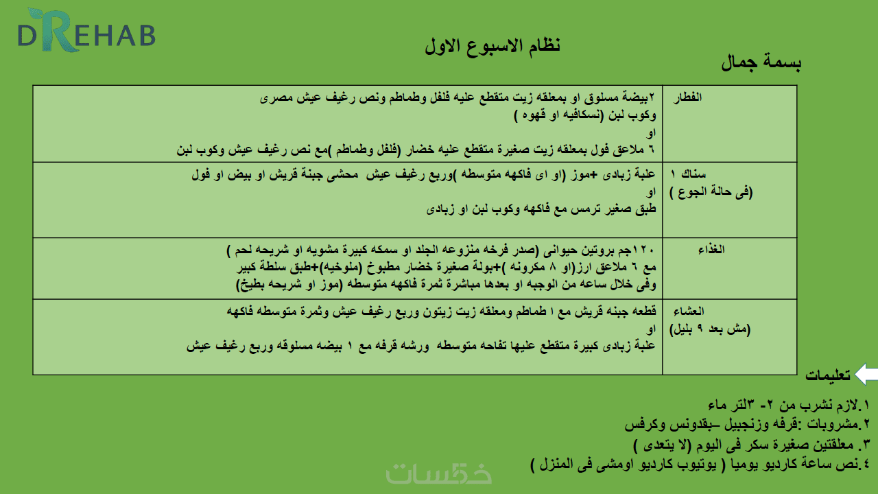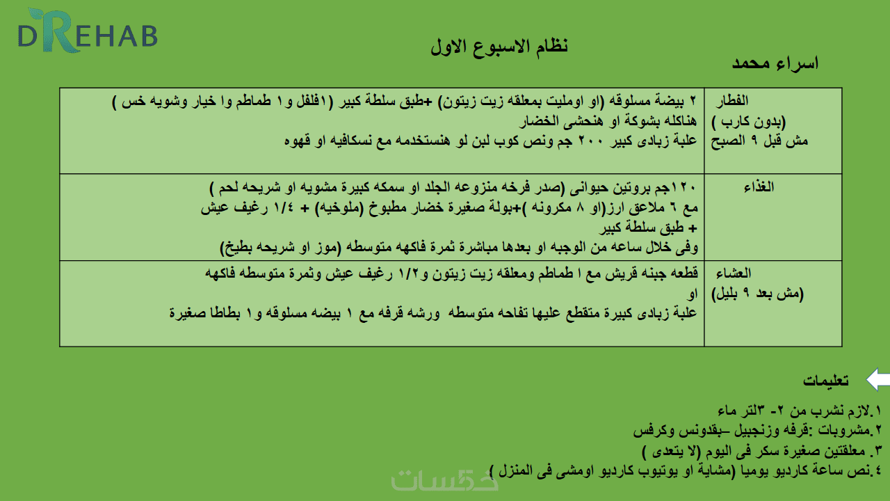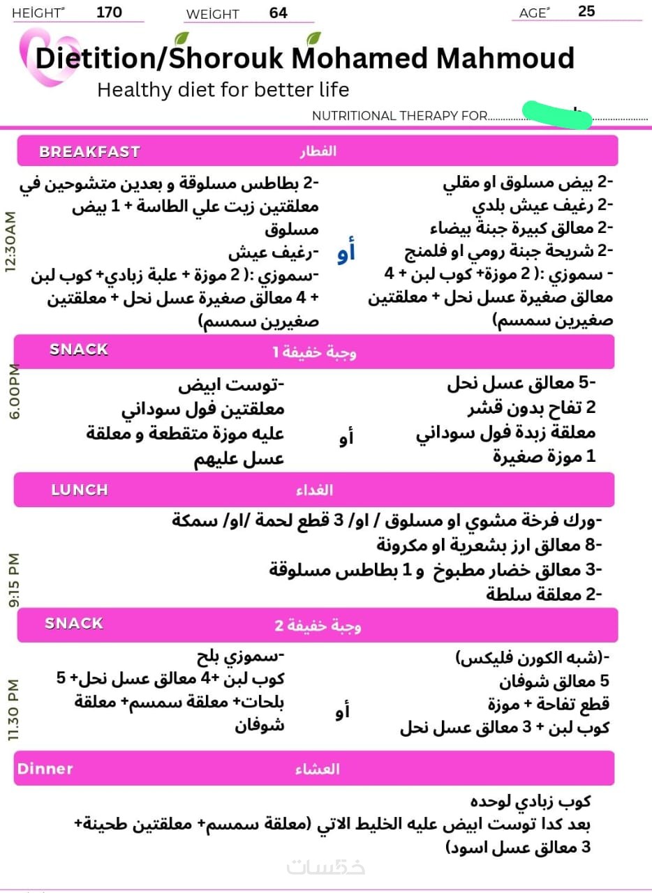 خطة عذائية مخصصة اسبوعيا لمدة شهرومتابعه