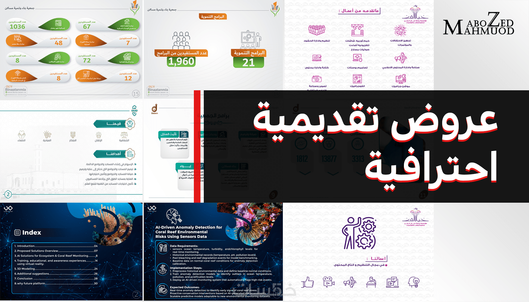 تصميم عروض وشرائح بوربوينت جذابة مناسبة لمختلف الطلبات.