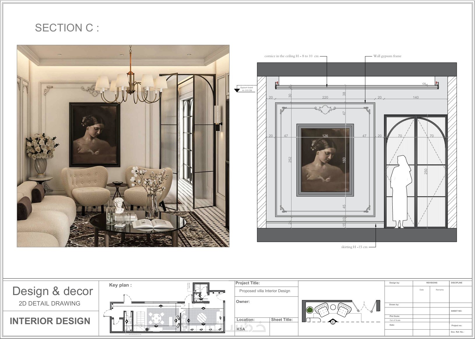 رسم بلانات وتصميم داخلي 2D احترافي مع توزيع فرش وإضاءة وجبس