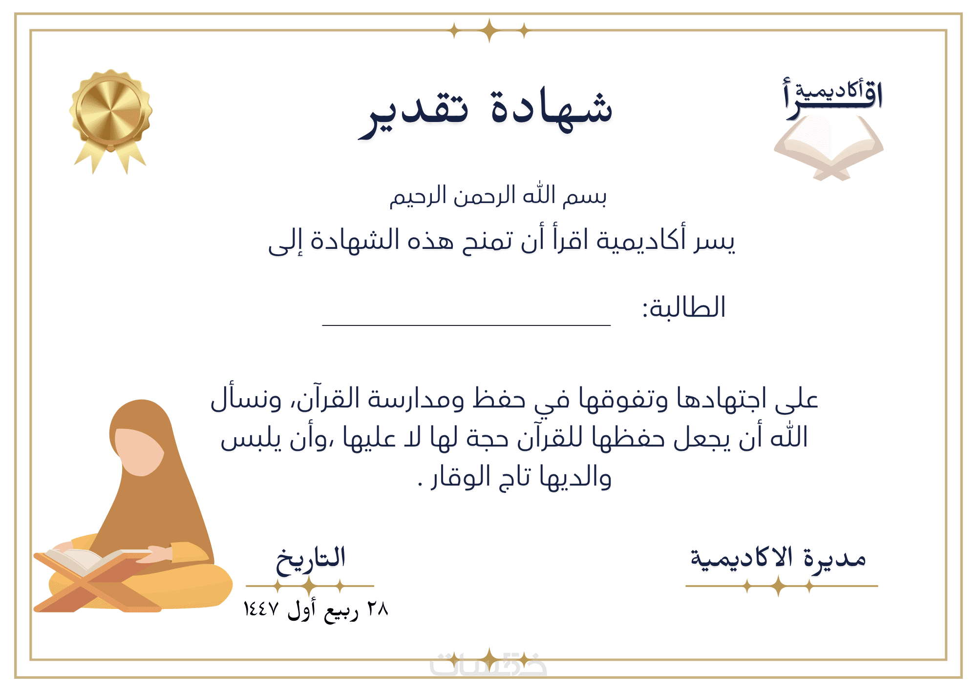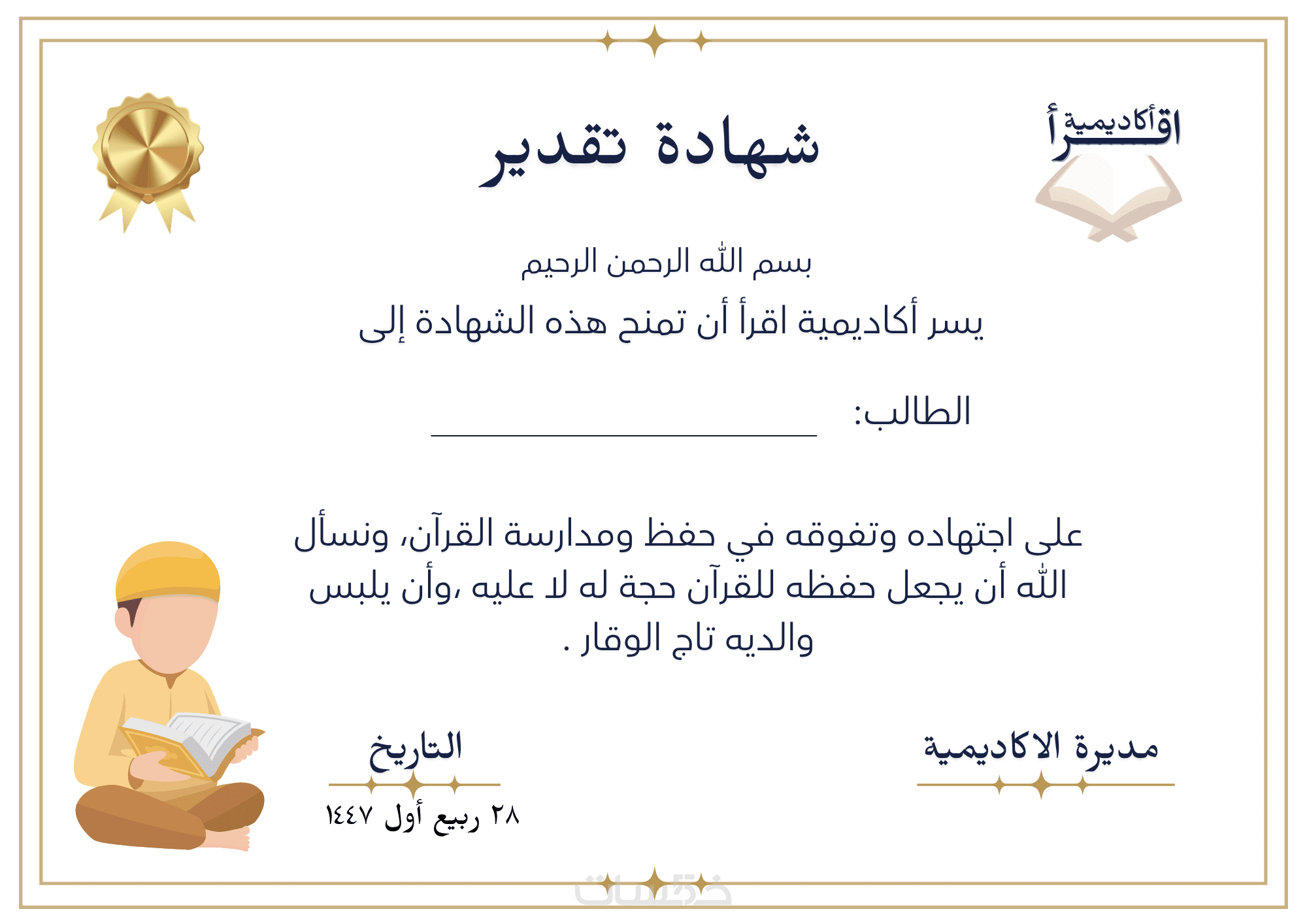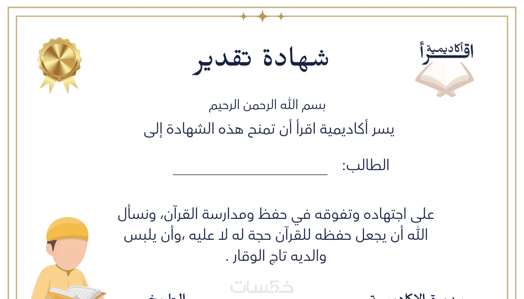 تصميم شهادات التقدير لمعلمين ومعلمات القران الكريم لطلابهم
