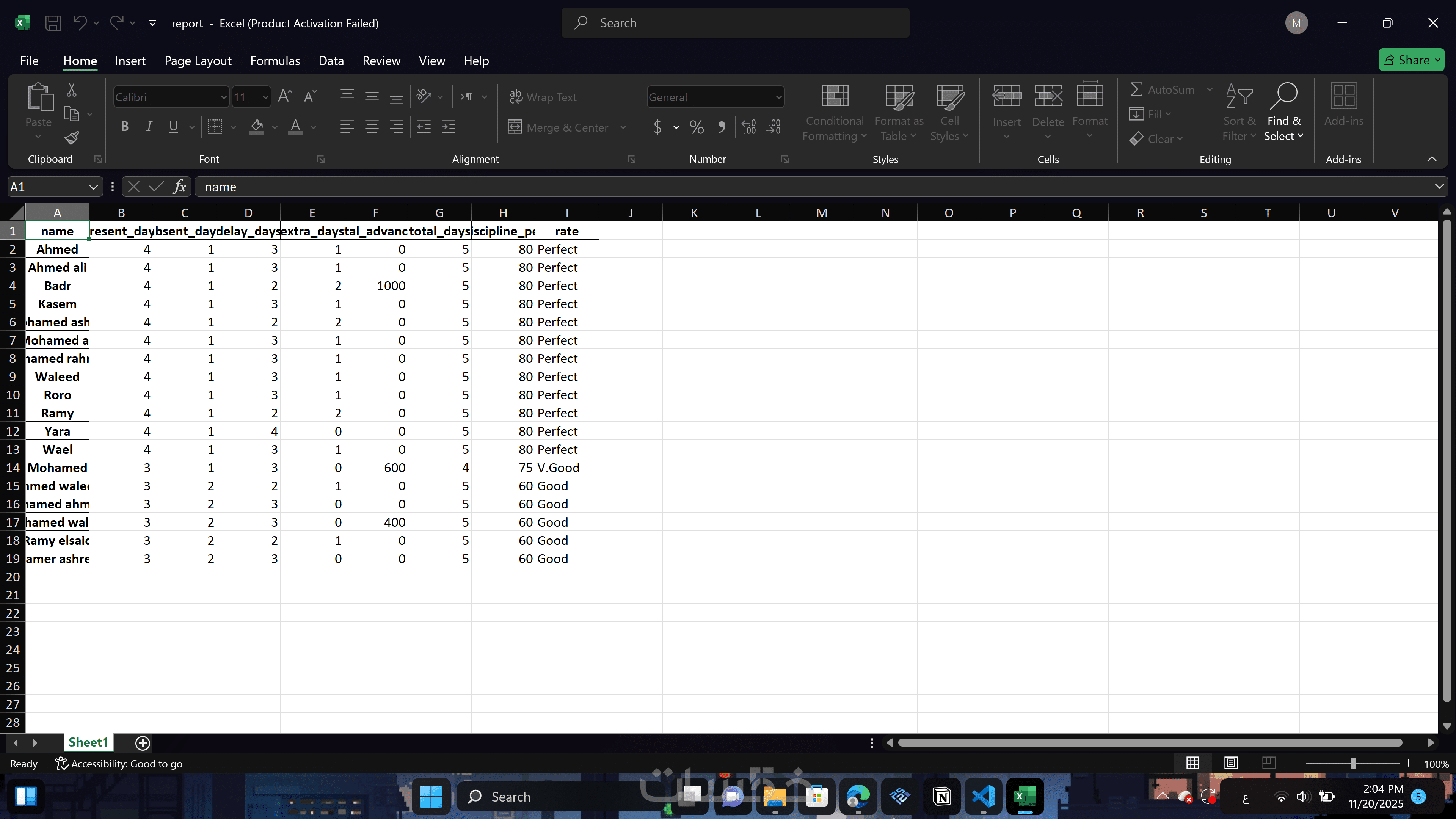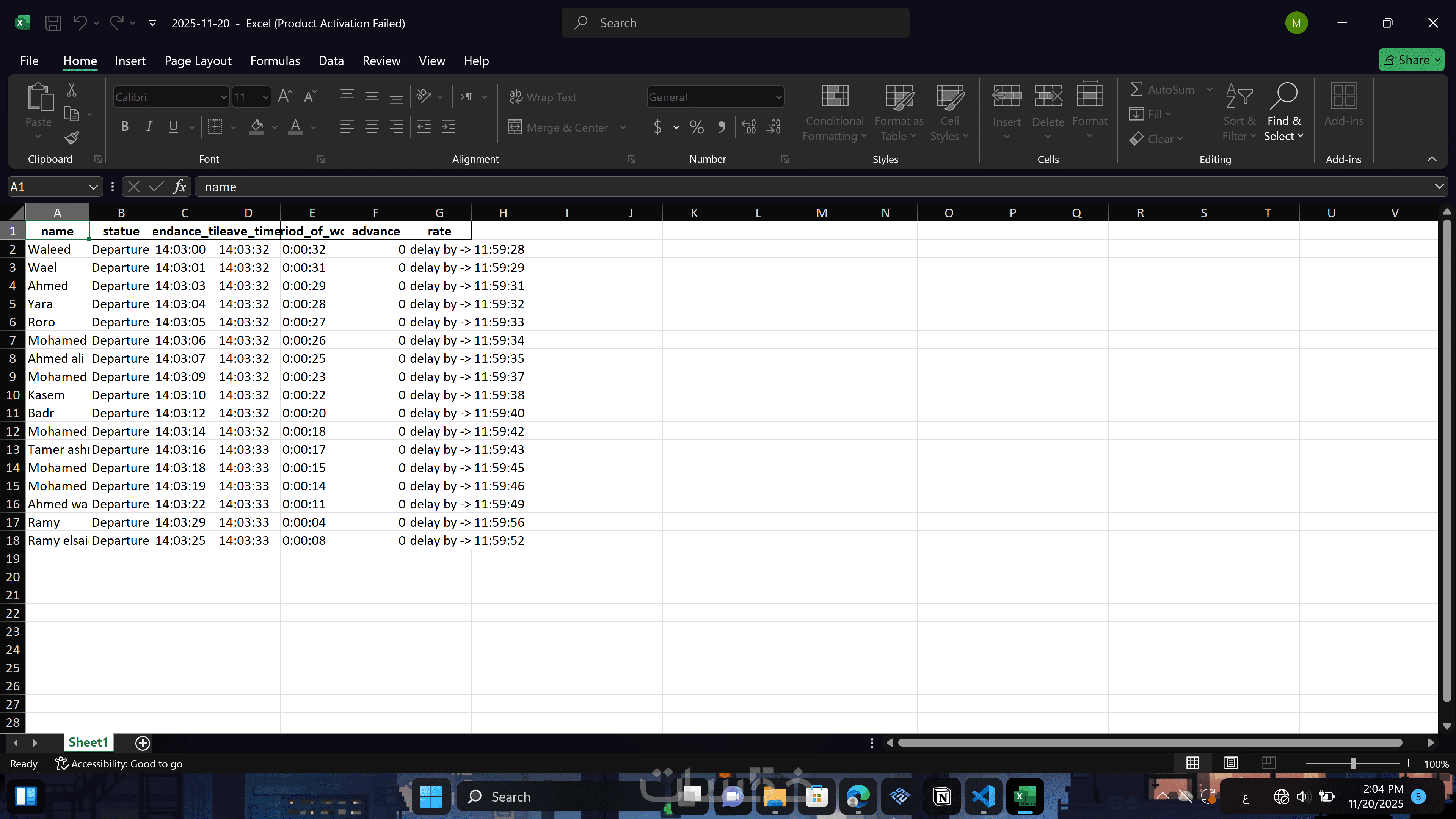شيت اكسيل عبارة عن سجل حضور وإنصراف للموظفين بالشركة