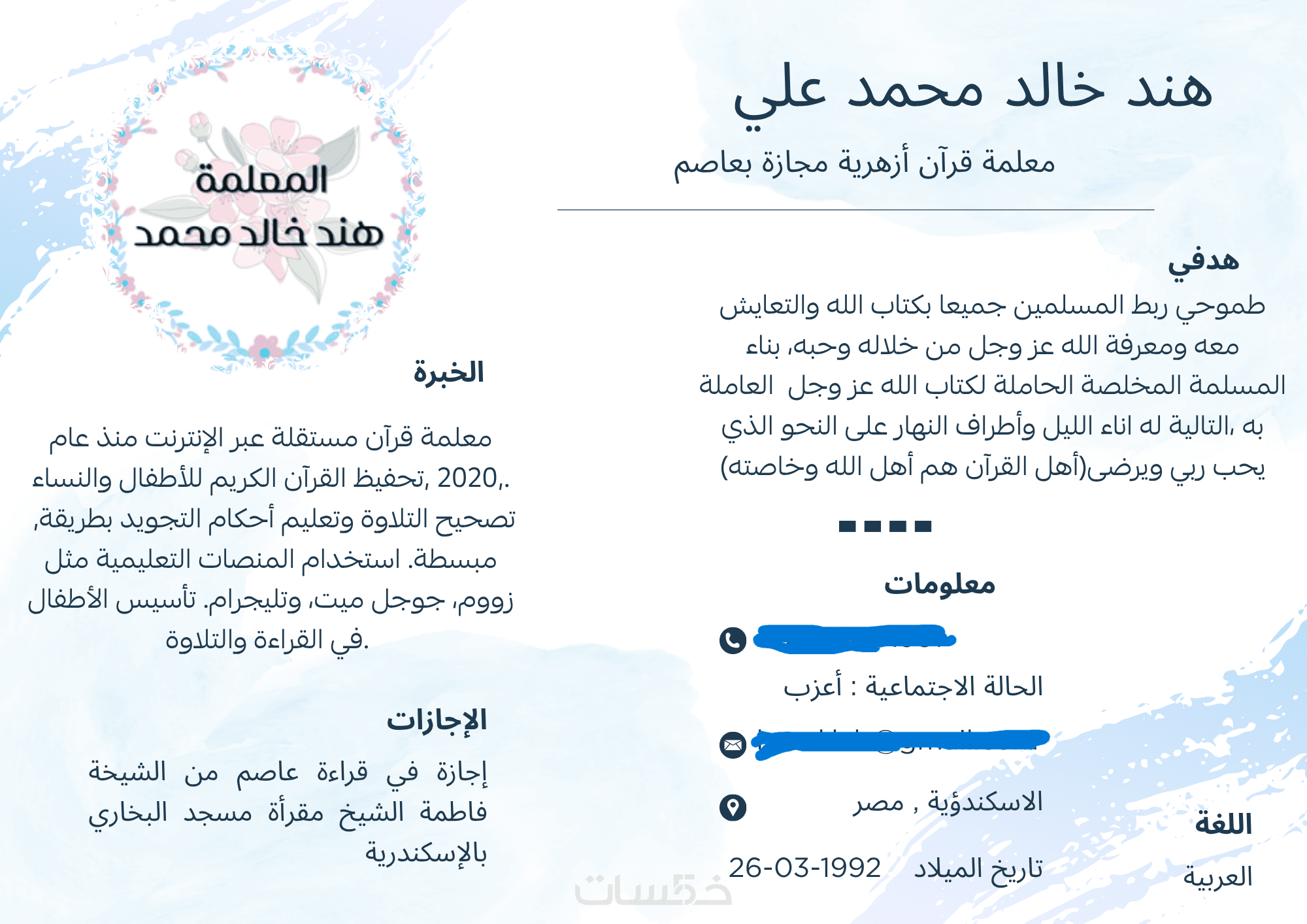 تحفيظ قرآن برواية و اقرائه محاضرة واحدة عبر ال skype