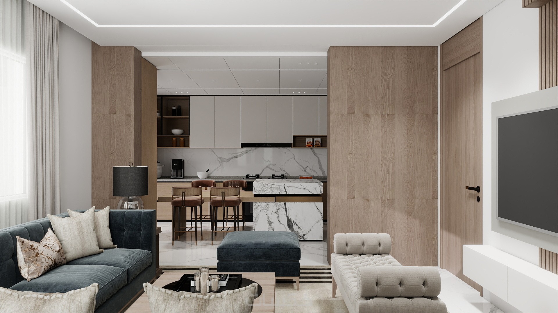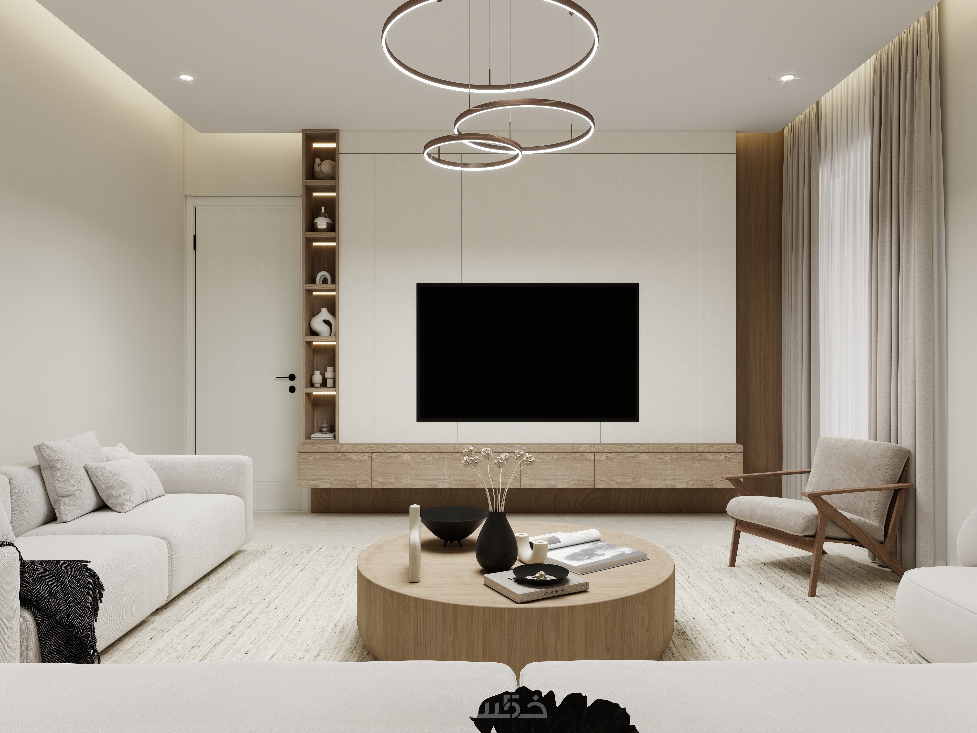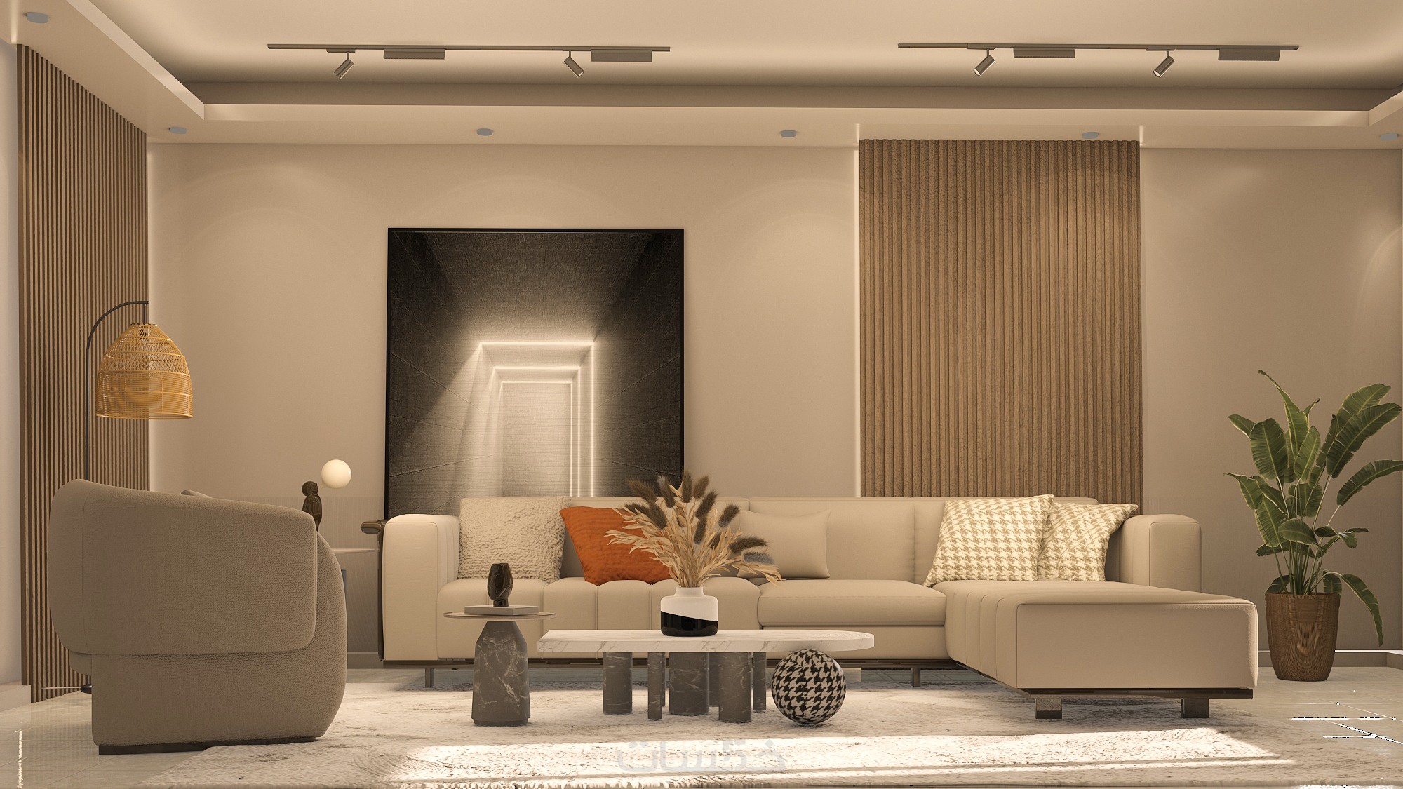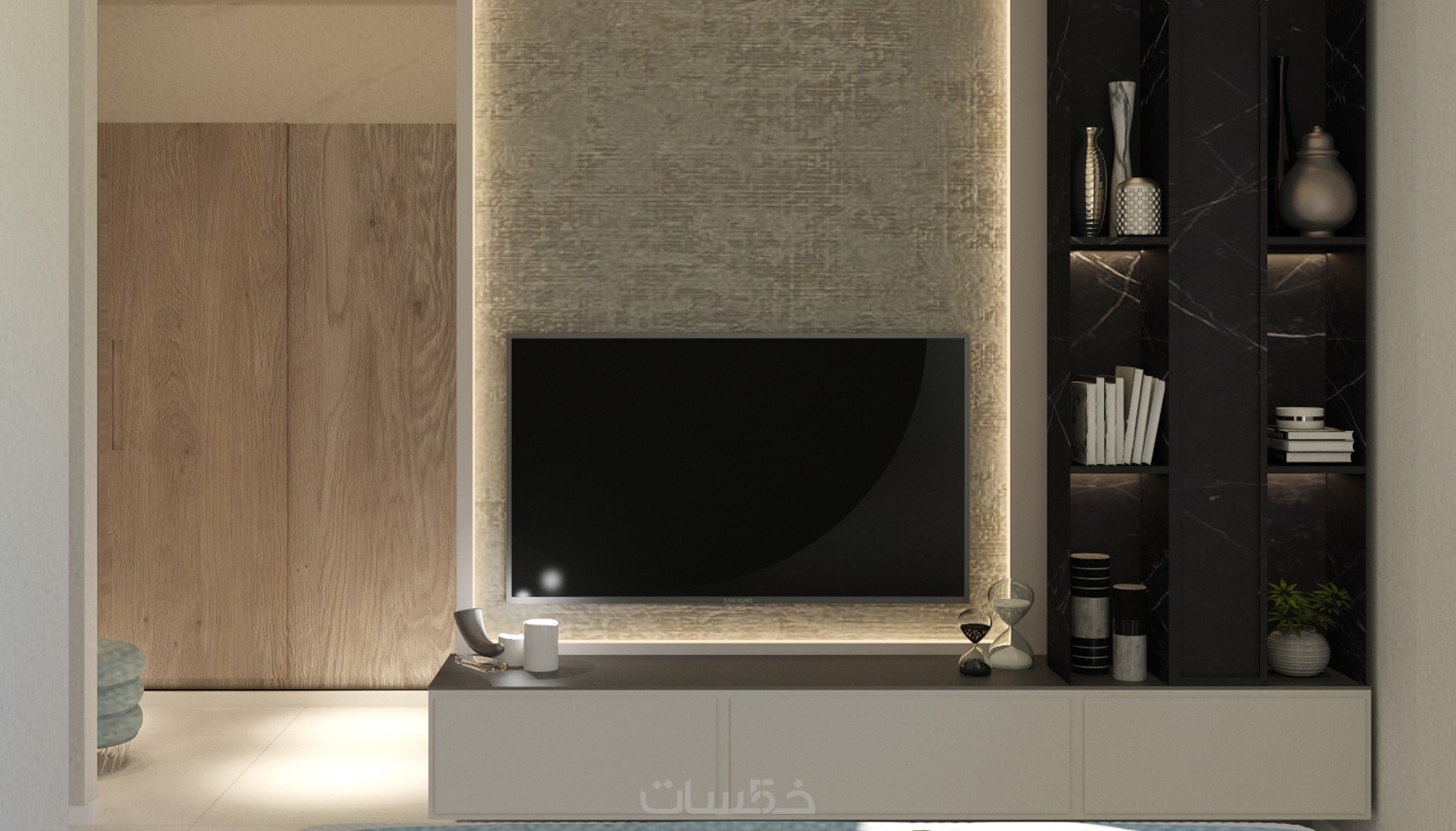تصميم ديكور لجزء من غرفة المعيشة باضاءة ليلية