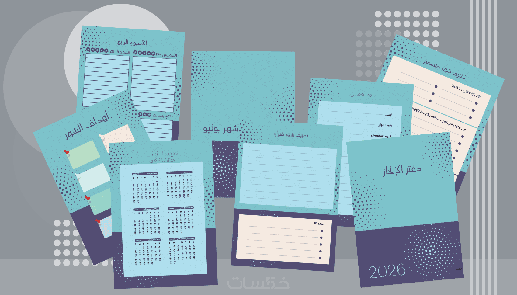 دفتر تخطيط سنوي 2026 وتقويم سنوي وملصقات وفواصل وأوراق أخرى