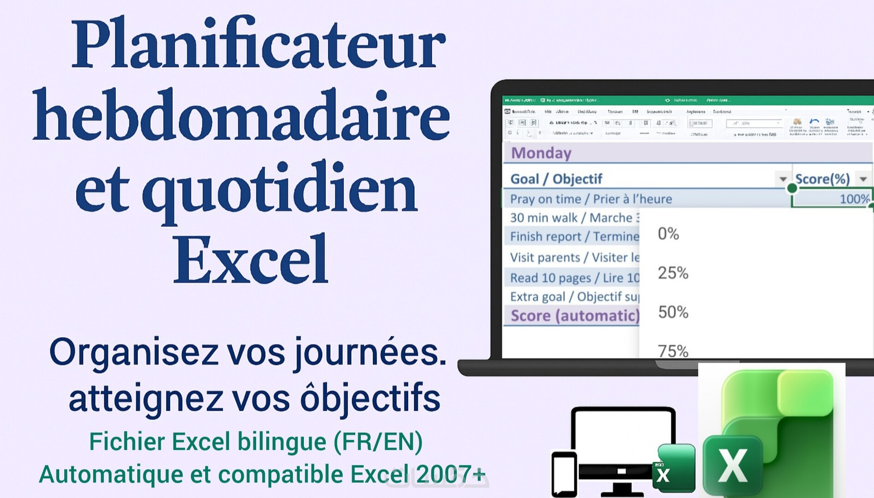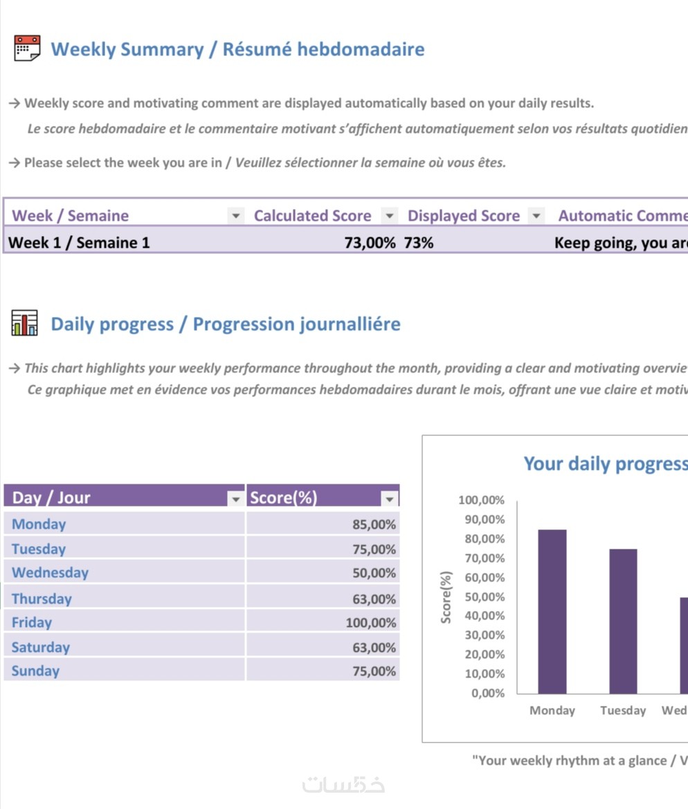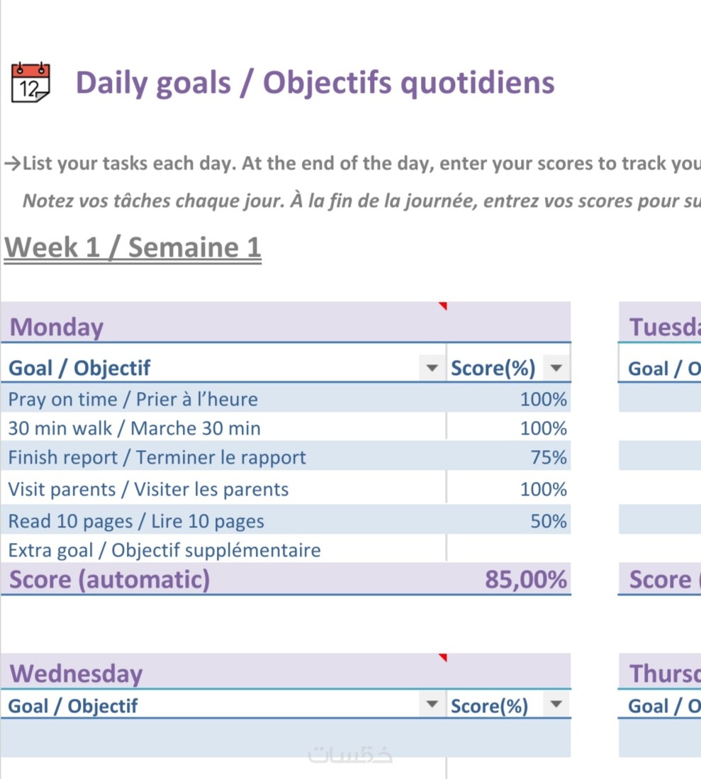سأصمم لك ملف Excel ثنائي اللغة لتتبع أهدافك اليومية والأسبوع