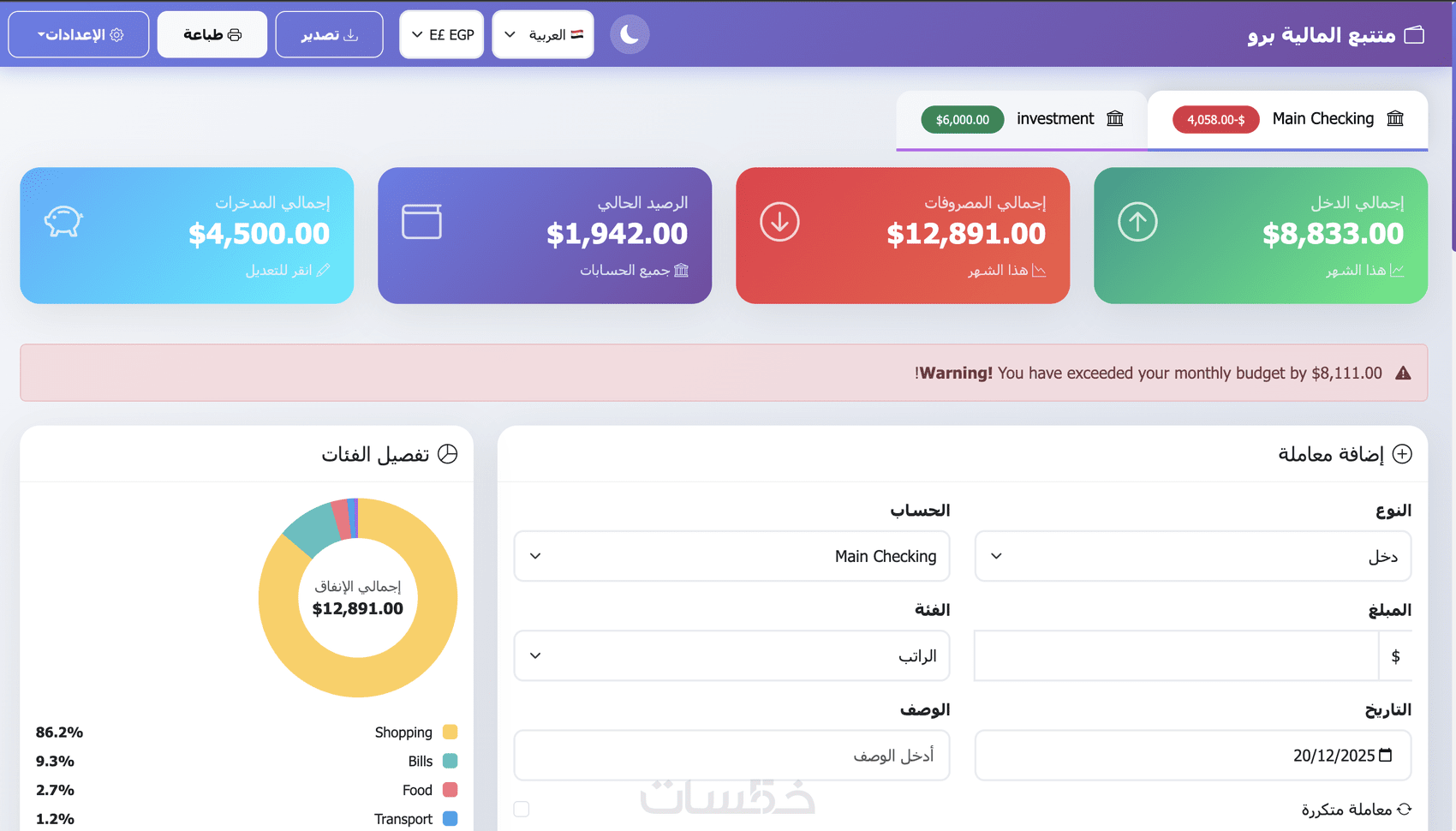 تصميم Dashboard لإدارة المصروفات والدخل باستخدام HTML و Boot