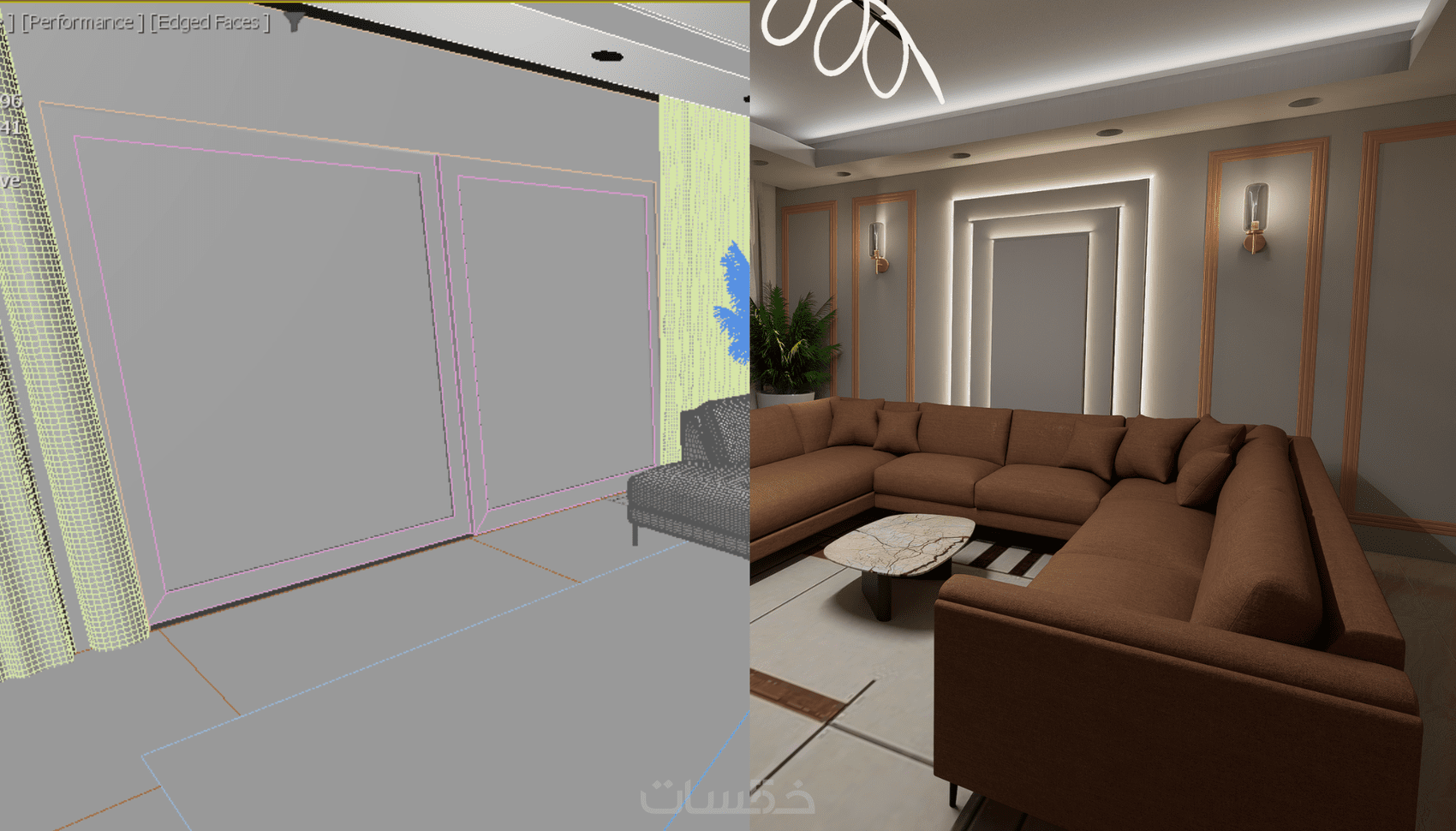 رندر معماري احترافي لنماذج 3D مع إضاءة وخامات دقيقة