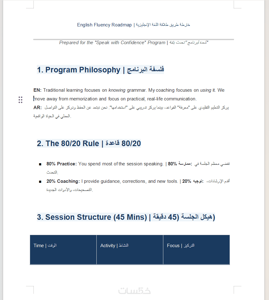 لن نكتفي بالشرح، بل سنقضي 80% من وقت الجلسة في محادثات حقيقية.