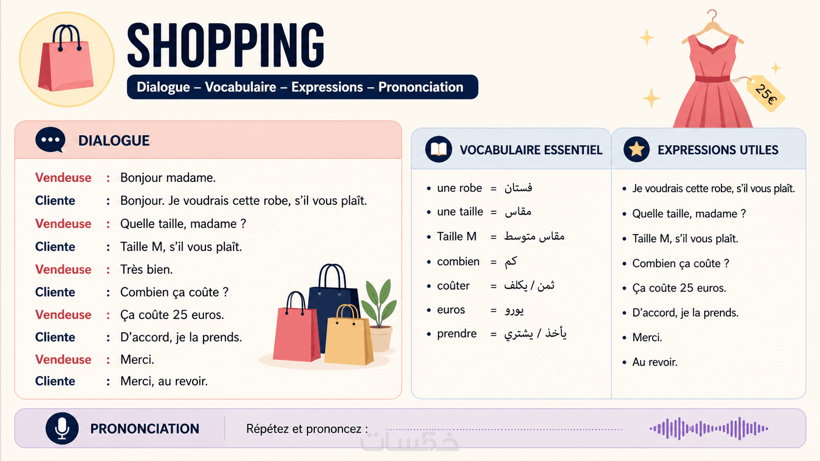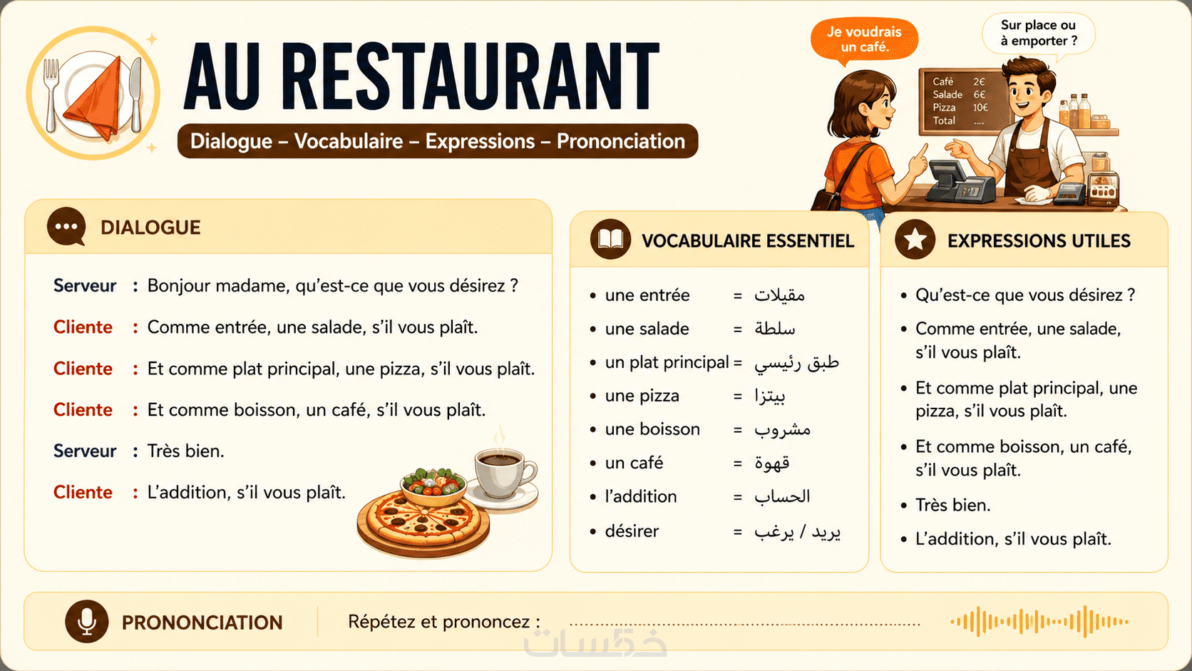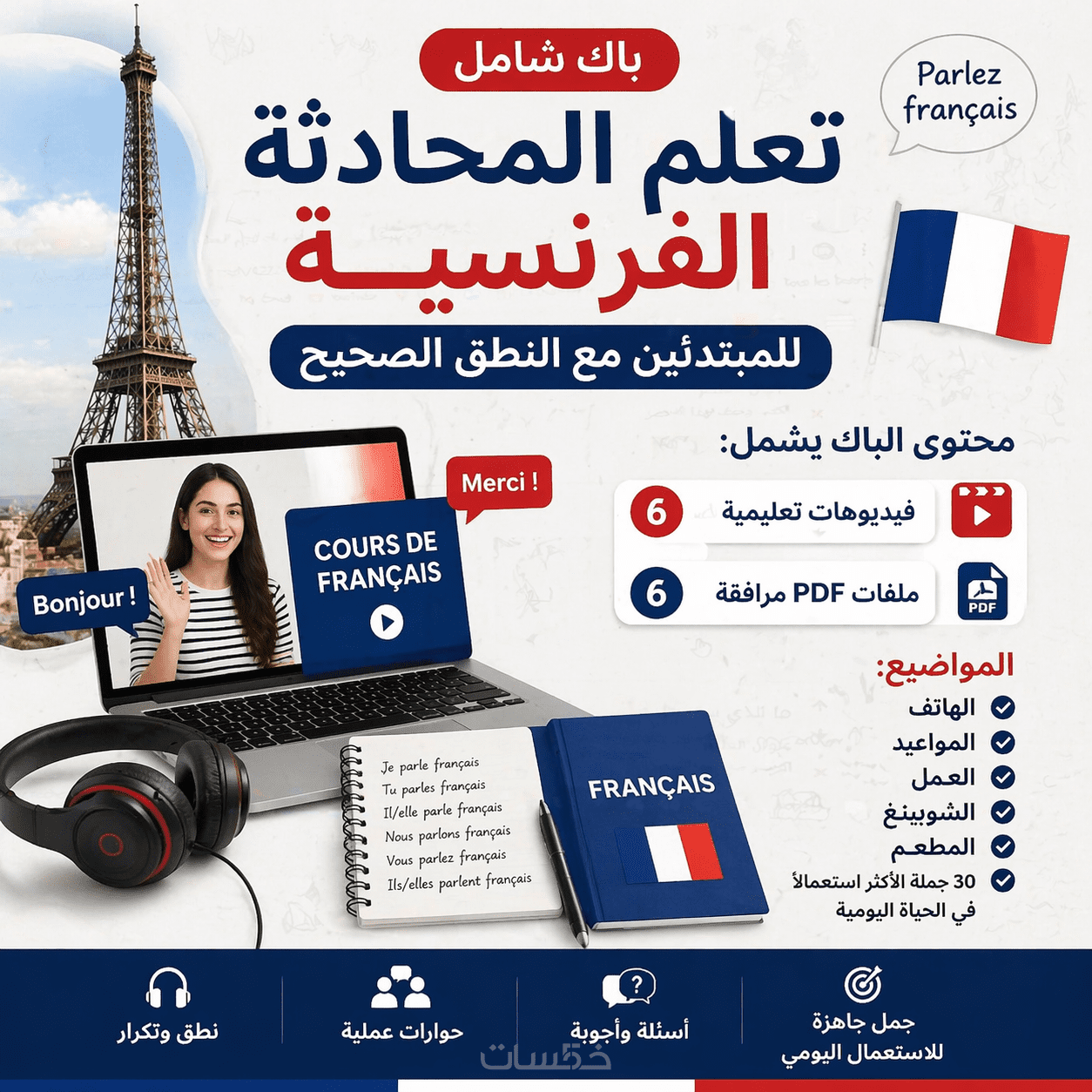 أقدم لك باكًا لتعلم المحادثة الفرنسية للمبتدئين (A1–A2) مبني على مواقف الحياة اليومية.
