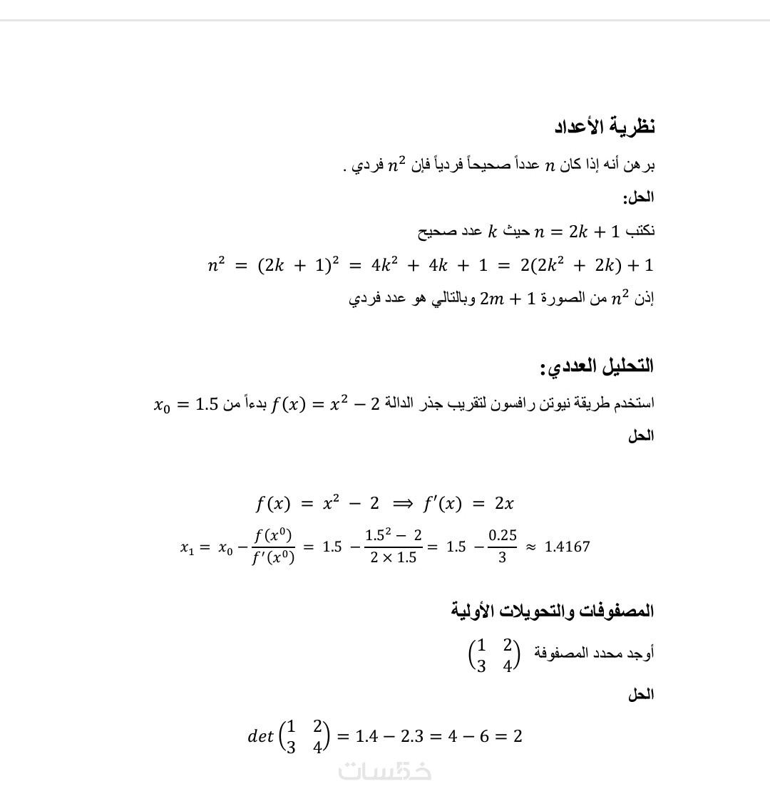 يفتح لك تعلم الرياضيات أبوابًا واسعة لإتقان أساليب التفكير المنطقي وتحليل المشكلات وحلها، ويتيح لك أيضًا النجاح في اختصاصك العلمي سواء في الرياضيات أو في العلوم التي تستند إليها في دراستها وتطبيقها، ويتواجد على موقع خمسات عشرات من خبراء الرياضيات المتقنين للاختصاص ممن يقدمون خدماتهم بسرعة وأمانة وأسعار عادلة، استعن بأحدهم الآن واضمن لنفسك النجاح والتقدم.