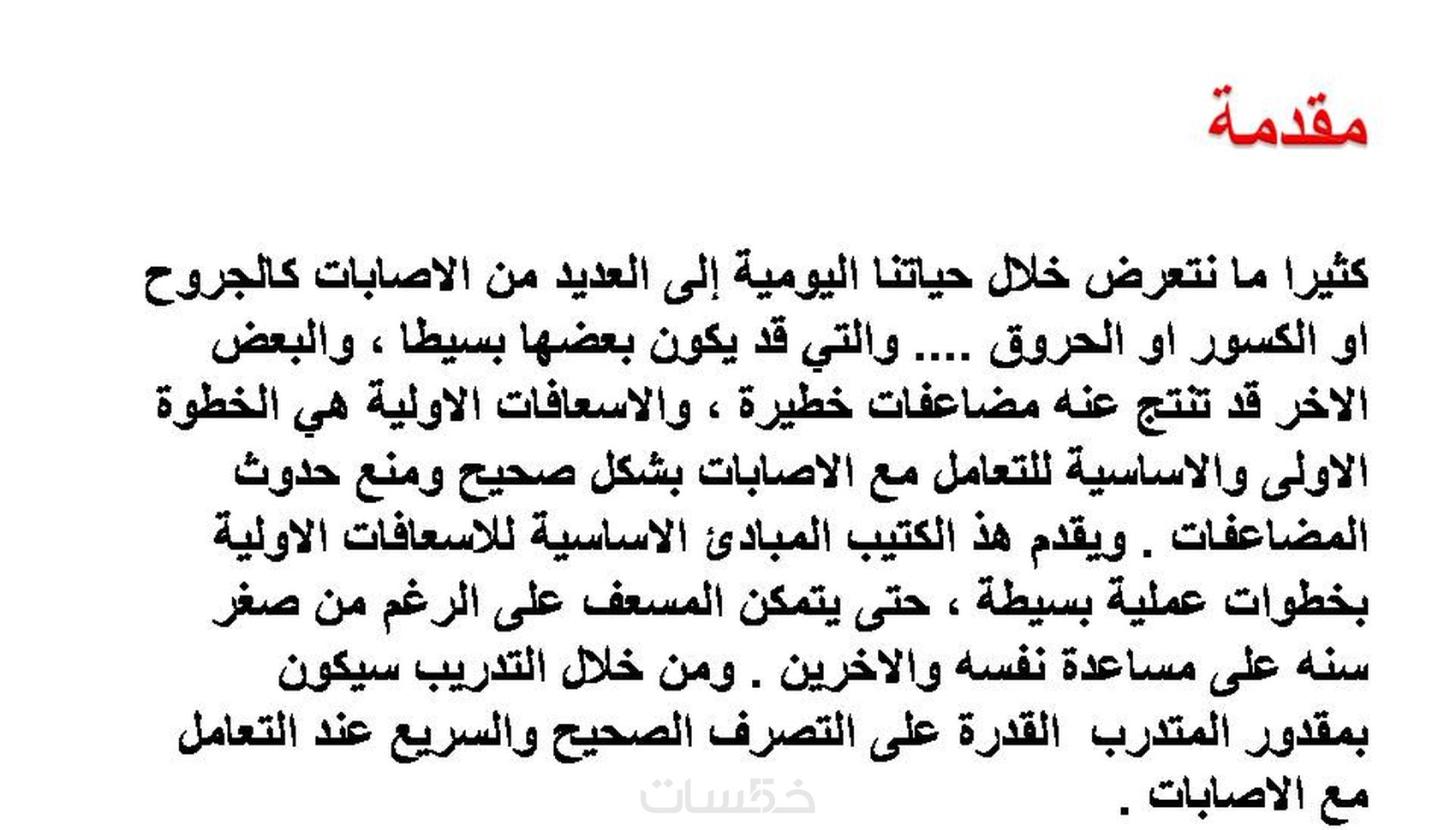 كثيرا ما نتعرض خلال حياتنا اليومية إلى العديد من الاصابات كالجروح او الكسور او الحروق .... والتي قد يكون بعضها بسيطا ، والبعض الآخر قد تنتج عنه مضاعفات خطيرة ، والاسعافات الأولية هي الخطوة الأولى والاساسية للتعامل مع الاصابات بشكل صحيح ومنع حدوث المضاعفات . ويقدم هذ الكتيب المبادئ الاساسية للاسعافات الأولية بخطوات عملية بسيطة ، حتى يتمكن المسعف على الرغم من صغر سنه وخبرته البسيطة على مساعدة نفسه والاخرين.