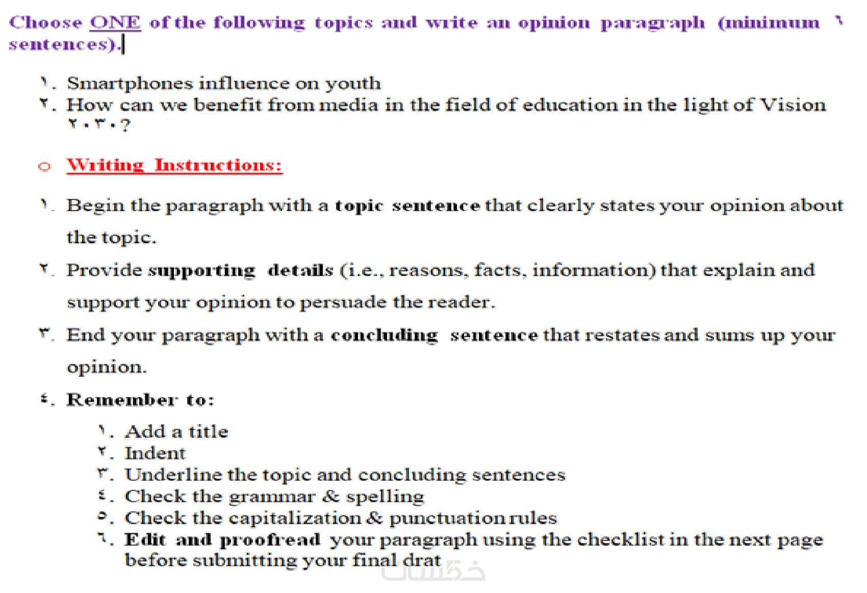 • عدد (50) سؤال من الأسئلة الاختيارية أو كتابة موضوع في حدود 300 كلمة