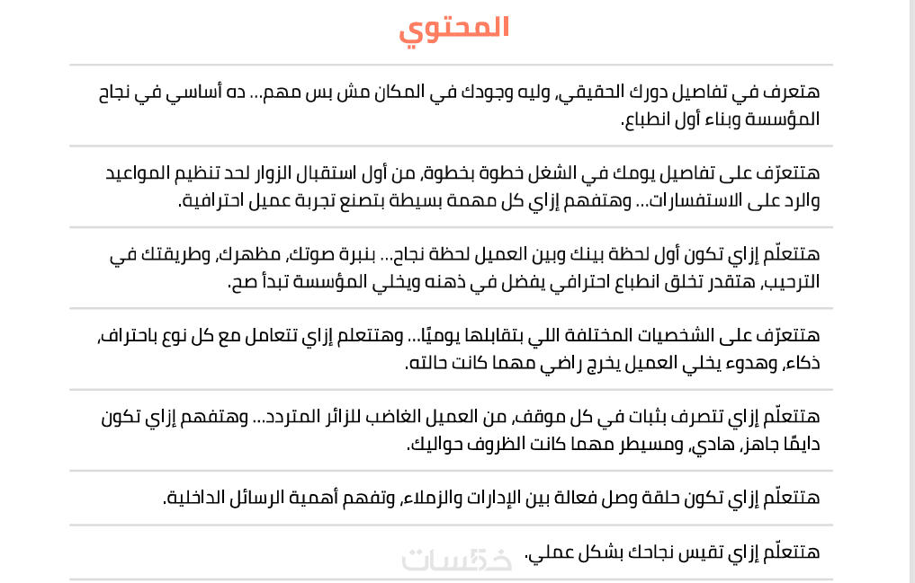 - محتوى تدريبي يشمل المهارات الأساسية للتعامل مع العملاء والظهور المهني