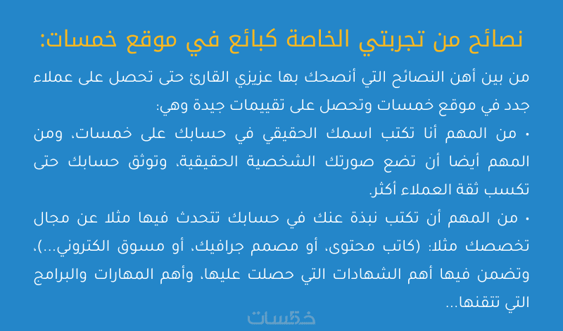 هو كتاب pdf من 33 صفحة جمعت فيه خلاصة تجربتي في الربح من موقع خمسات للبائعين الجدد الذين لم يحصلوا على أية مبيعة في موقع خمسات، أو الذين يواجهون مشاكل في الحصول على عملاء جدد باستمرار.
